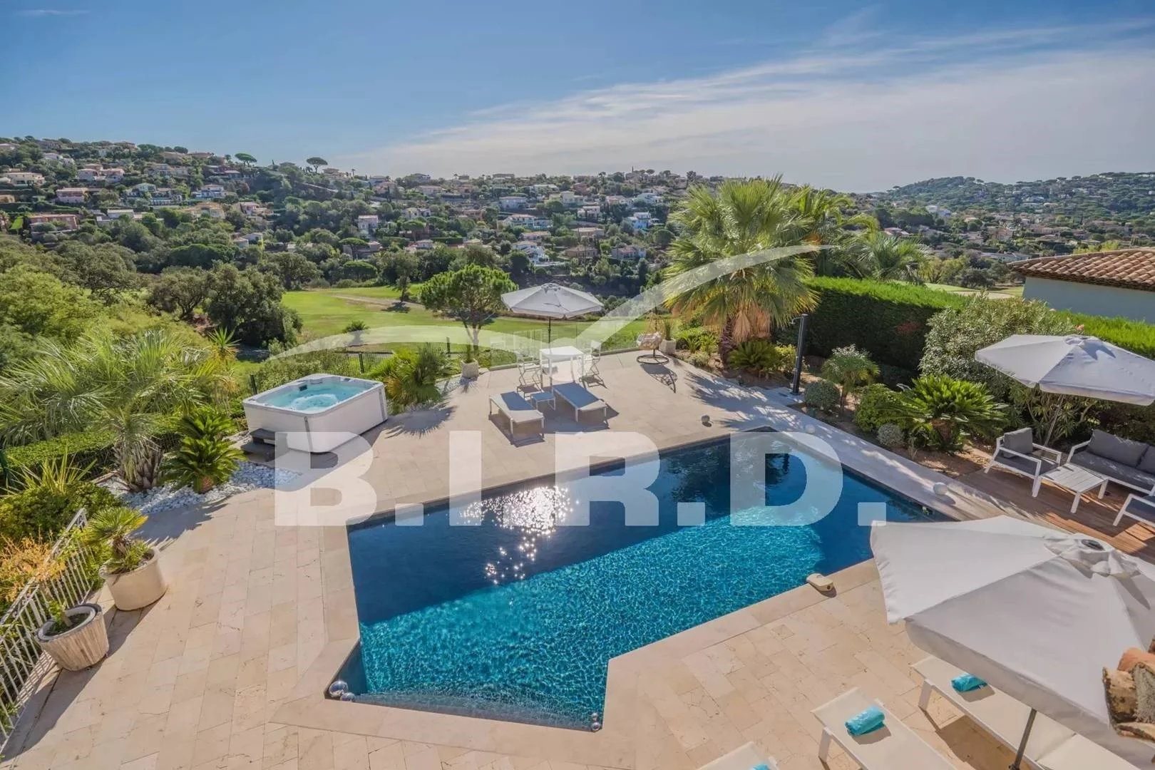 A Sainte-Maxime, pour vos vacances, nous vous proposons cette magnifique villa de 180 m² entièrement climatisée avec vue dégagée sur le golf. A seulement quelques minutes des plages de la Nartelle ! Elle se compose de plain-pied de : une cuisine ouverte équipée et aménagée, un séjour, une salle à manger, de 4 chambres de plain-pied, de 3 salles deau. À l'étage, 1 chambre de maître avec salle de bains et wc. À l'extérieur, un salon dété, barbecue au gaz, boulodrome, grande terrasse, une piscine au sel de 9x4m (chauffée en option), jacuzzi. Les plus : buanderie, parkings pour de nombreuses voitures, climatisation (dans toutes les pièces), Wi-Fi.. N° d'enregistrement : SB Check-in/out en haute saison (min 7 jours) : du samedi au samedi A régler sur place : dépôt de garantie et taxe de séjour