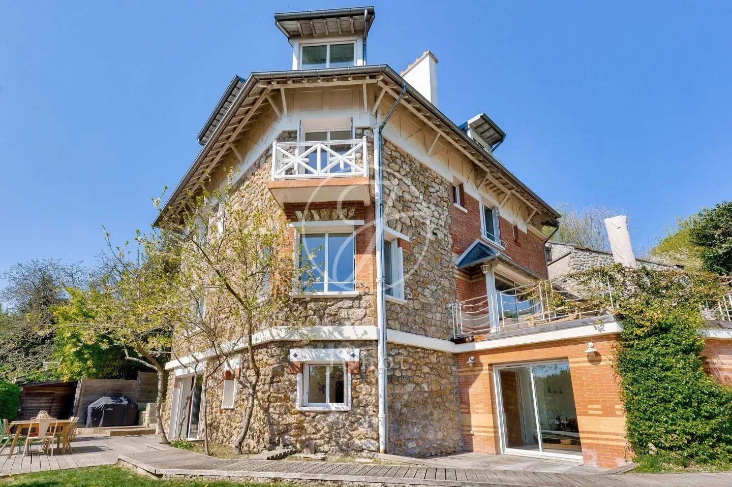 Dans le quartier le plus recherché de Sèvres, sur les hauteurs prisées de Brancas, à deux pas de Boulogne-Billancourt et du parc de Saint-Cloud, découvrez cette somptueuse maison en meulière de 279,59 m² loi Carrez, entièrement rénovée avec des matériaux nobles et des finitions haut de gamme. Nichée dans un écrin de verdure, cette propriété de caractère allie le charme authentique de l'ancien à un confort contemporain d'exception. Baignée de lumière, elle bénéficie d'une vue époustouflante depuis ses nombreuses terrasses, offrant un cadre de vie rare, calme et verdoyant. La maison s'organise sur plusieurs niveaux, en rez-de-jardin un vaste espace modulable ouvre sur une terrasse plein sud et se prête parfaitement à une salle de jeux, un home-cinéma ou un appartement indépendant selon les besoins. On y trouve également une salle de sport, une salle de douche avec toilettes, une buanderie équipée, une chaufferie et de nombreux rangements. Au niveau principal, une entrée élégante mène à un double séjour lumineux avec cheminée et triple exposition, une salle à manger ouvrant sur une terrasse panoramique, ainsi qu'une cuisine contemporaine entièrement aménagée, pensée pour allier fonctionnalité et esthétisme. À l'étage, trois grandes chambres enfants avec dressings intégrés, une salle de bains avec douche et baignoire, ainsi que des toilettes séparées. Le dernier niveau accueille une suite parentale aux volumes généreux, composée d'une vaste chambre, d'un dressing/boudoir et d'une salle de bains privative avec douche à l'italienne et toilettes. Une cinquième chambre ou bureau complète cet étage. En complément, la maison dispose d'une cave à vin, de plusieurs abris de jardin et d'un garage double. Lumineuse, spacieuse et pleine de charme, cette demeure saura séduire les amateurs de belles propriétés par ses volumes, ses vues dégagées et son emplacement privilégié, à proximité immédiate des commerces, des écoles de renom et des transports. Disponible immédiatement. Honoraires location résidence principale: rédaction bail 12€TTC/m², état des lieux 3€TTC/m². Honoraires bail code civil: 10%Ht (12%Ttc) du loyer annuel Hc. Dépôt de garantie: 5.900€. Exclusivité. Contact: /