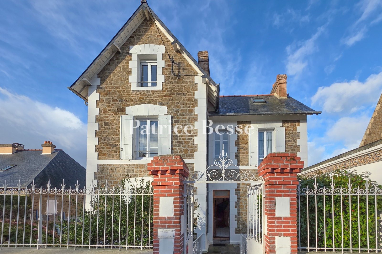 À Saint-Malo, dans un quartier résidentiel, face à la mer, une villa du début du 20e s. Et son jardin clos de murs. La propriété est close de murs et exposée est-ouest. À l'est, côté rue, un mur en pierre surmonté de grilles marque l'entrée de la cour intérieure, via un portillon encadré de piliers de brique. À l'ouest, un jardin en pente douce est exposé plein ouest vers la mer, avec en fond de propriété un accès à un chemin jusqu'à la plage voisine. La maison fut édifiée au début du 20e s., selon les standards de construction de la maison de villégiature, en moellon de granit apparent avec chaînages d'angle et entourage de baies harpés en ciment peint. Construite sur un plan en L avec trois travées, elle est coiffée d'une toiture en ardoise à deux pans, surmontée de trois souches de cheminée en brique. Les murs sud et ouest sont enduits. Un garage fut accolé ultérieurement à la façade côté rue.