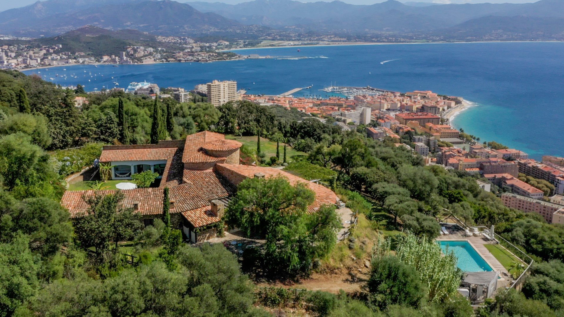 Idéalement située sur les hauteurs d’Ajaccio, au sommet de la colline du Salario surplombant la ville, dans un environnement naturel préservé, à seulement quelques minutes du centre-ville, à 7 km de l’aéroport d’Ajaccio, et à proximité immédiate des plages de sable blanc de la Route des Sanguinaires et de Capo di Feno, Myah vous propose en exclusivité cette propriété d’exception, bénéficiant d’une vue mer panoramique à 180 degrés. La villa A Giraffa : somptueuse villa en pierre sèche de style méditerranéen, nichée au cœur de la nature et offrant une vue spectaculaire sur la mer et le golfe d’Ajaccio. Développant 550 m² de surface intérieure, elle est implantée sur un jardin paysager de 6 000 m² et peut accueillir jusqu’à 14 personnes. Avec sa piscine sécurisée, ses nombreuses terrasses et ses prestations haut de gamme, cette propriété figure parmi les plus belles villas de la Cité impériale. La villa s’articule autour de vastes espaces de réception baignés de lumière. Le grand salon, ouvert sur la mer, communique harmonieusement avec la cuisine intérieure entièrement équipée, créant un espace convivial et élégant, idéal pour partager des moments en famille ou entre amis. L’Ensemble s’ouvre sur de larges terrasses aménagées avec salons extérieurs, offrant un cadre privilégié face à la mer et à la piscine. Une cuisine d’été extérieure, équipée d’une plancha et d’une machine à glaçons, complète parfaitement les espaces de vie et permet de profiter pleinement des journées et soirées estivales. La villa dispose de 5 suites, chacune conçue comme un véritable cocon, avec salle de bain privative et terrasse, garantissant confort, intimité et indépendance à chaque occupant. Quatre d’entre elles sont de plain-pied et communiquent directement avec un jardin en pelouse face aux montagnes. La cinquième suite, la master room, située à l’étage, bénéficie d’une vue époustouflante sur la mer et le golfe d’Ajaccio. Un studio indépendant vient compléter l’ensemble. Entièrement équipé avec cuisine et salle de bain, il peut accueillir 2 adultes et 2 enfants grâce à des lits superposés, idéal pour une famille ou du personnel accompagnant. Les extérieurs ont été soigneusement aménagés pour offrir un cadre de vie exceptionnel, dans un calme absolu au cœur de la nature : Piscine sécurisée avec vue mer et coin bar pour les apéritifs, jardins méditerranéens composés de nombreuses essences sélectionnées avec soin pour créer une ambiance naturelle, multiples terrasses et salons extérieurs.