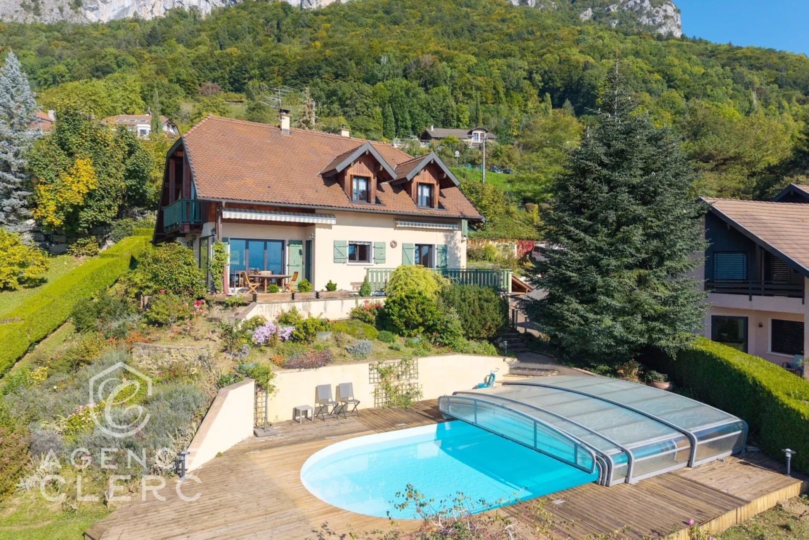 Veyrier-Du-Lac, située dans l’un des villages les plus prisés de la rive Est, cette maison traditionnelle offre un fort potentiel et une vue dégagée sur le lac d’Annecy. Développant 173,62 m² habitables (pour 341,13 m² utiles), elle se compose de 4 chambres et 3 salles de bains, le tout sur un beau terrain paysager d’environ 1.500 m² avec piscine et garage double. Baignée de lumière et idéalement exposée, cette propriété séduira les amateurs de belles surfaces et d’authenticité, souhaitant repenser les volumes selon leurs envies. Un cadre calme et résidentiel, à deux pas du centre du village et de toutes les commodités. Rez de jardin :salon salle à manger avec cheminée, une cuisine, véranda, lingerie, une chambre avec sa salle de bains, WC 1er étage : spacieuse mezzanine/bureau, 3 chambres, une salle d'eau, WC Sous-sol : une cave à vins, buanderie Wc, garage double de 59 m², chaufferie, une salle d'eau/sauna Piscine 10 5 m au chlore