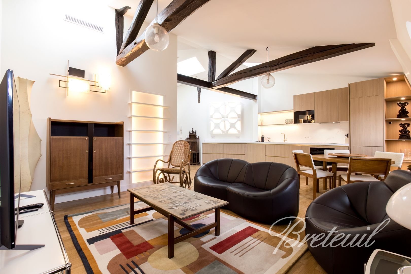 Immeuble ancien bien entretenu, très bel appartement entièrement rénové de 93 m² (83 m² Loi Carrez), au sixième et dernier étage, desservi par ascenseur. Entrée avec placards, séjour avec cuisine ouverte aménagée et équipée, dégagement avec placards (espace buanderie), trois chambres avec placards (dont chambre parentale avec salle d'eau et toilettes), salle d'eau et toilettes séparées. Très belles prestations : climatisation, double vitrage, Velux motorisés.. Résidence avec services inclus : internet (box), ménage (1 h/semaine), alarme, coffre. Disponible immédiatement.
