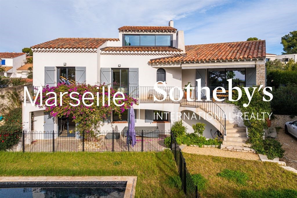 À seulement 300 mètres de la plage, au sein d'une résidence privée de Barqueroute à Carry-le-Rouet, découvrez cette villa de 1965 entièrement rénovée en 2022 dans un style contemporain, mêlant harmonieusement charme de l'ancien et confort moderne. Édifiée sur trois niveaux, elle offre 200 m² habitables ainsi qu'un vaste garage, sur un terrain de 800 m² agrémenté d'une terrasse et d'une piscine chauffée. Dès l'entrée, vous serez séduits par le séjour lumineux à double exposition Sud-Est / Nord-Ouest, prolongé par une cuisine ouverte aménagée et entièrement équipée. Un balcon côté façade et un jardin intimiste à l'arrière permettent de profiter d'ambiances variées pour les repas ou moments de détente en extérieur. Le niveau principal accueille également deux chambres exposées Sud-Est (avec possibilité d'en créer une troisième), chacune disposant de sa salle de bain et de rangements intégrés. À l'étage, une troisième chambre, baignée de lumière grâce à sa large baie vitrée, bénéficie de sa propre salle de douche, offrant une véritable autonomie. En rez-de-jardin, accessible par l'intérieur ou directement depuis l'extérieur, un appartement indépendant a été aménagé : deux chambres, un séjour et une cuisine séparée. Un espace idéal pour recevoir famille et amis, ou pour créer une salle de jeux, un bureau, un atelier ou un espace adolescents. Un grand garage vient compléter l'ensemble. Un bien rare, idéalement situé, offrant espace, prestations et un cadre de vie privilégié à deux pas de la mer.