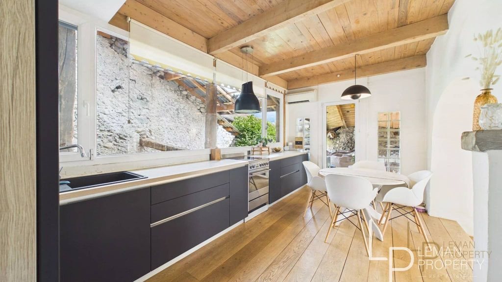 "Ancienne école" du village, cette maison de charme rénovée allie calme et bon vivre. De grands volumes baignés de lumière, des parquets en chêne massifs et des hauts plafonds, une cuisine moderne, un grand salon séjour avec cheminée pour le confort de l'hiver. Un sous-sol/buanderie pour le rangement et une grange attenante pour un agrandissement ou la création d'une annexe supplémentaire. Un petit jardin agréable, clos et reposant. Proche des gares pour les liaisons du Leman Express.