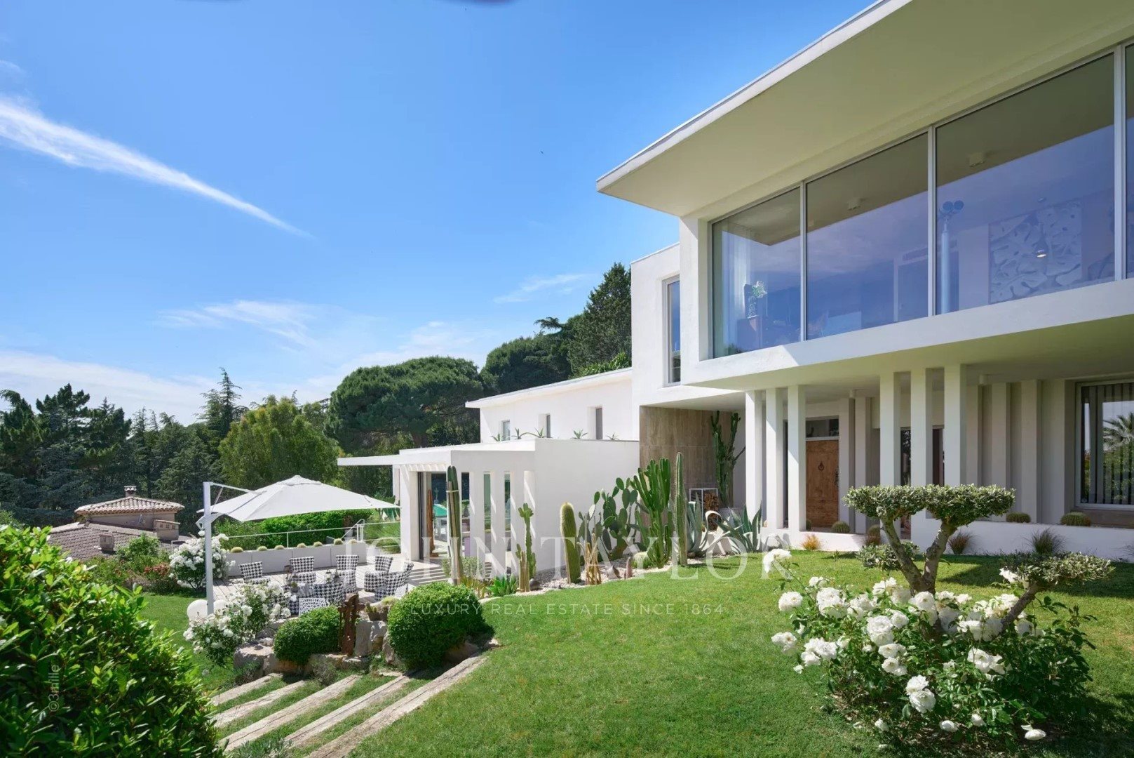 A la recherche d'un lieu d'hébergement pour un séjour réussi à Cannes, cette villa offre tout le confort et les prestations nécessaires pour vous accueillir pendant les congrès, séjours professionnels.. Notre savoir faire et notre expérience a votre disposition pour vous proposer un lieu adapté à votre projet. Dans le quartier très calme et résidentiel de la Croix des Gardes, au fond d'une impasse en cul de sac, au calme absolu, à 10 min à pied du centre-ville, belle villa contemporaine neuve de 500 m2 habitables entièrement climatisée et rénovée avec des prestations haut de gamme, au cœur d'un jardin paysagé de 3 000 m2. Exposition plein sud, vue féerique dégagée sur le Suquet, le massif de l'Estérel et les Iles de Lérins. Entrée Chambre (lit 140 cm), vue mer – Salle de douches Petit salon avec bibliothèque coin cheminée Belle réception comprenant salon et salle à manger, Tv miroir, s'ouvrant sur les terrasses – vue mer Cuisine parfaitement équipée ouverte sur la salle à manger et donnant sur le jardin, la salle à manger d'été et la piscine Toilettes invités Cave à vin Salle de sport, vue mer - douche/WC - Sauna pour 5 personnes Niveau + 1 : Chambre (lit 140 cm), vue mer – Dressing – Salle de douches Chambre (lit 140 cm), vue mer – Salle de douches Toilettes indépendants Buanderie (lave-linge – sèche-linge) Appartement indépendant avec entrée indépendante : chambre (lit 140 cm), – Dressing – Salle de douches / Wc – Petit salon avec kitchenette équipée Niveau + 2 : Suite de Maître (lit 160 cm) avec salle de bains ouverte / douche - Toilettes séparées Grande Piscine (17 m) à débordement Nombreuses terrasses et coins détente / lounge Le tout offrant de très belles vues mer Pinède privée Grand parking extérieur fermé (6 voitures) Equipement : Système d'alarme vidéosurveillance - Hifi bose wifi dans toute la maison.