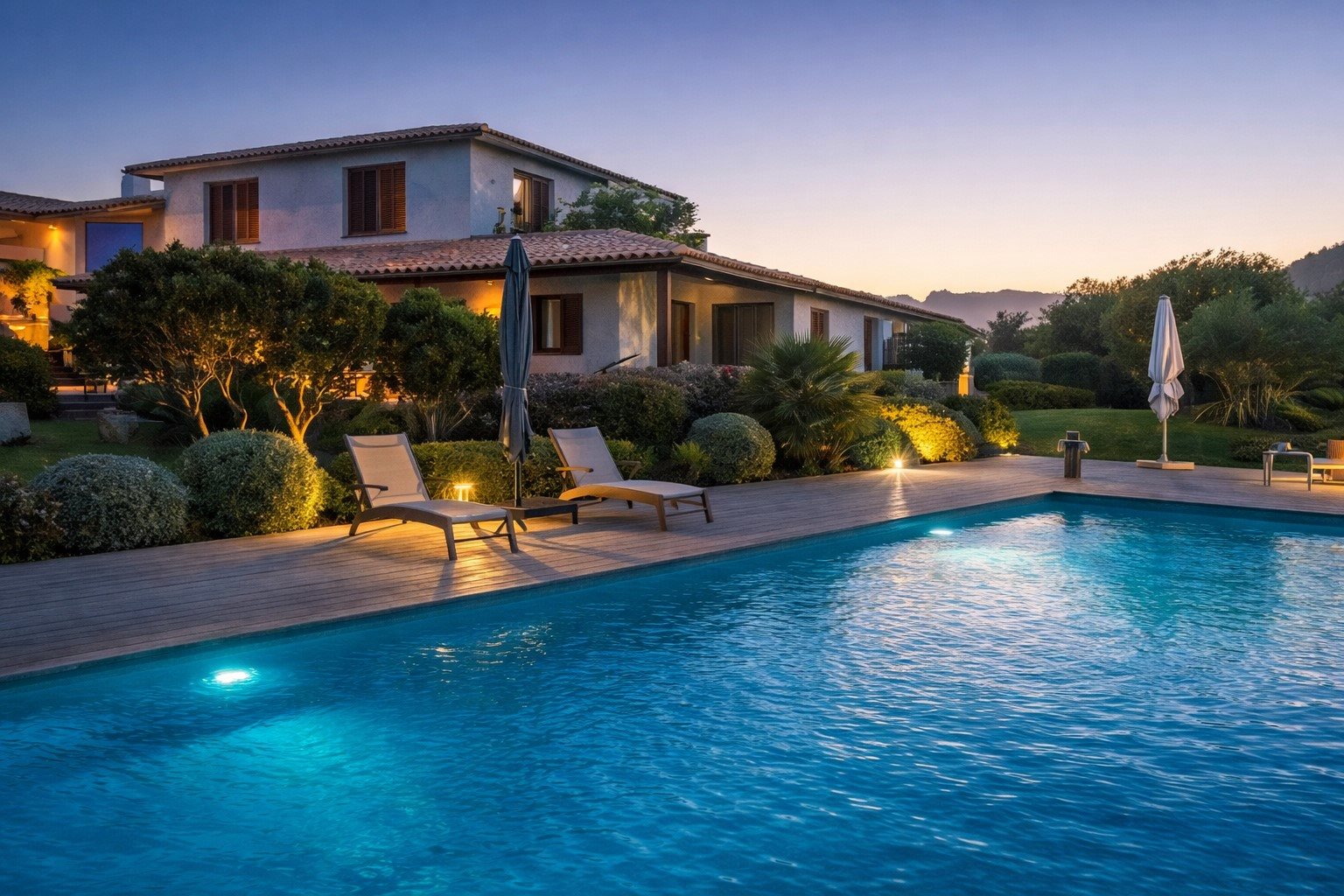 Villa Avec Piscine Et Jardin Bord De MER Au sud de Porto-Vecchio, face à la Sardaigne dans un domaine privé cette propriété est exceptionnelle par son emplacement, elle offre un spectacle à plus de 180° sur les plus beaux paysages de Corse du Sud ! la Sardaigne, les iles Cerbicales, la plage de Palombaggia et le golf de Santa Giulia. Édifiée sur un parc arboré de 4000 m2, d’une surface habitable d’environ 300 m2, cette très belle réalisation contemporaine est desservie par de vastes et multiples terrasses en teck, les volumes sont épurés et les espaces sont baignés de lumière. La piscine à débordement de 13X5 m donne l’impression d’être suspendue au-dessus de l’eau, elle offre un spectacle sans limites, entouré d’un joli jardin paysagé.