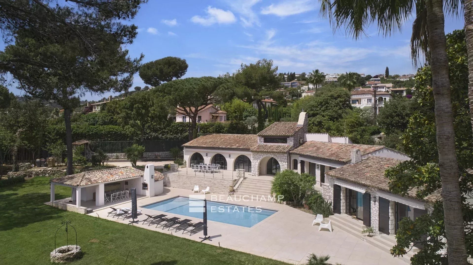 Sur les hauteurs de Golfe-Juan, à seulement 10 minutes en voiture des plages et restaurants, cette superbe villa provençale entièrement rénovée et climatisée se situe dans un quartier résidentiel, au cœur d’un terrain plat de 3 000 m². Offrant une surface habitable de 300 m² sur trois niveaux, elle dispose de 6 chambres et bénéficie d’une petite vue mer. Rez-de-jardin : Entrée menant à un vaste espace de réception ouvrant sur une belle terrasse, comprenant un salon, un coin salle à manger et une cuisine ouverte entièrement équipée. Suite parentale avec accès à la terrasse, salle de bains/douche et Wc. Chambre avec accès à la terrasse, salle de douches et WC. Étage Chambre avec salle de douches. Rez-de-piscine (entrée indépendante) : Chambre ouvrant sur la terrasse côté piscine, avec salle de douches et Wc. Chambre ouvrant sur la terrasse côté piscine, avec salle de bains/douche et Wc. Chambre avec salle de douches et Wc. Kitchenette Extérieurs et équipements : Piscine. Pool-house avec kitchenette équipée (réfrigérateur, plaques de cuisson, Bbq). Douche et toilettes extérieures. Garage et parking. Système d’alarme nocturne. Internet Free, fibre optique et prises Ethernet murales dans toutes les pièces principales. Numéro d'enregistrement : Ci