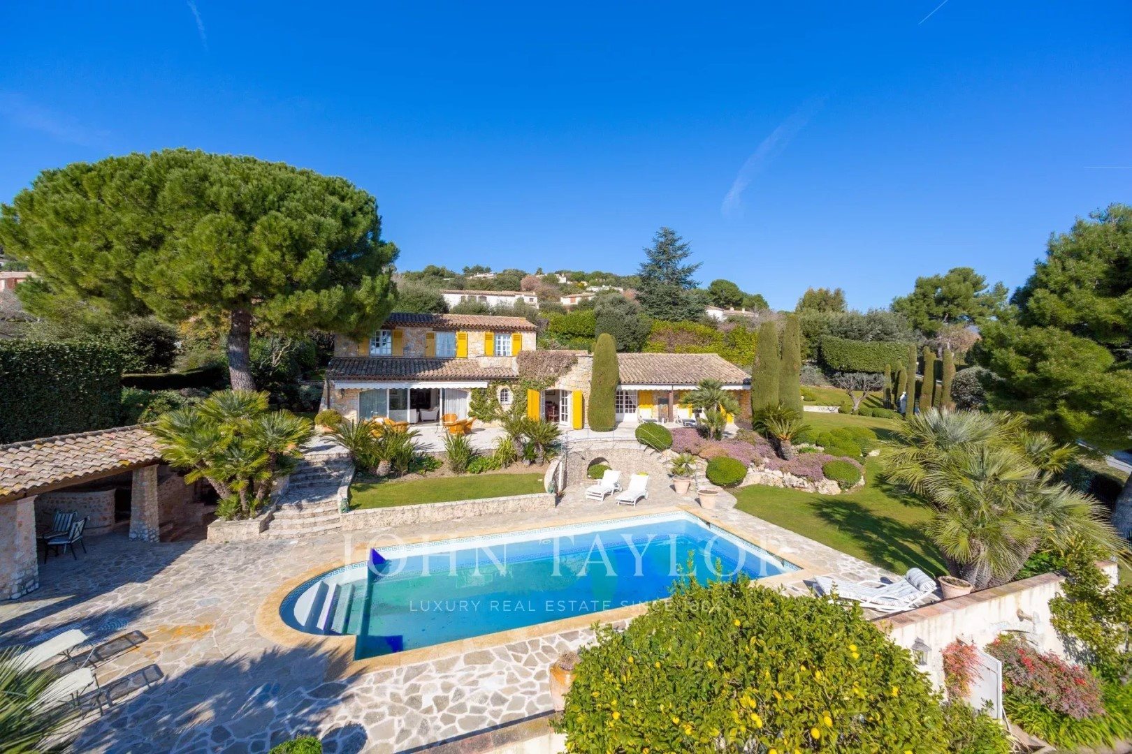 Somptueuse propriété en pierres, dans un domaine privée, au calme, avec vues dominantes sur la mer et le village de Saint-Paul de Vence et bénéficiant d'un magnifique jardin paysager. La villa principale se compose comme suit : Rez-de-chaussée : - entrée - salle à manger, séjour, salon télé - bureau - 3 chambres - 3 salles de bains - cuisine et arrière-cuisine - garage 1er étage : - chambre de maîtres avec salle de bains Maison de gardiens indépendante. Piscine avec poolhouse, studio de 30 m2 Les informations sur les risques auxquels ce bien est exposé sont disponibles sur le site Géorisques :