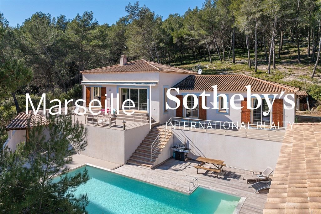 Exclusivité - À vendre aux portes de Cassis, villa contemporaine de 215 m² sur un vaste terrain de 4 000 m² avec piscine. Cette propriété nichée dans un écrin de verdure vous séduira par son environnement rare et sa quiétude absolue, à l'abri des regards. La maison principale se compose d'une grande pièce de vie lumineuse orientée vers l'extérieur, avec salon et cuisine américaine, de trois chambres dont une suite parentale et d'une salle de bain. Une dépendance de 61 m² permet d'accueillir famille, amis ou de développer une activité indépendante. À l'extérieur, une grande piscine invite à la détente au soleil, complétée par un jacuzzi niché dans un coin intimiste du jardin. Deux vastes garages fermés d'environ 50 m² chacun viennent compléter l'ensemble, offrant de multiples possibilités de stationnement ou de stockage. Un bien rare, à l'emplacement recherché, idéal pour les amoureux de la nature et du calme, tout en étant proche des commodités et des plages de Cassis.