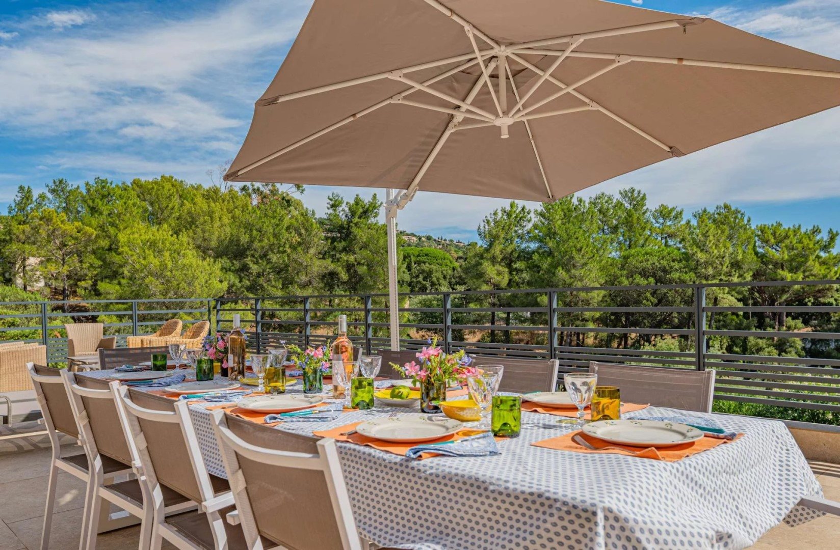 Nichée au cur du Golf de Beauvallon, à quelques pas seulement des eaux scintillantes de la Méditerranée, cette élégante villa provençale rénovée avec goût invite à savourer la douceur de vivre du Sud. Dès lentrée, une atmosphère chaleureuse se déploie dans la vaste pièce de vie, où séjour, salle à manger et cuisine équipée souvrent en toute harmonie sur une terrasse ensoleillée, idéale pour des moments de convivialité ou de détente. Une première suite complète ce niveau, offrant confort et sérénité. Au rez-de-jardin, lespace nuit se décline en une chambre pour enfants avec sa salle de bains et trois belles suites avec salles deau privées, chacune tournée vers lextérieur. De là, un accès direct mène à la piscine chauffable en option, véritable écrin de fraîcheur, entourée de verdure et de quiétude. Les extérieurs, joliment paysagés, révèlent lart de vivre méditerranéen : un jardin parfumé, un terrain de pétanque pour les longues soirées dété, deux douches extérieures pour prolonger la sensation de vacances, ainsi quune grande terrasse conviviale. La piscine, sécurisée par une barrière aux normes et entourée de larges espaces, appelle à la détente sous le ciel azur. Enfin, plusieurs places de stationnement complètent ce cadre enchanteur. Un havre de paix où chaque détail a été pensé pour allier confort moderne et charme intemporel, dans lune des adresses les plus prisées du Golfe de Saint-Tropez. N° d'enregistrement : En Cours À régler sur place : dépôt de garantie et taxe de séjour