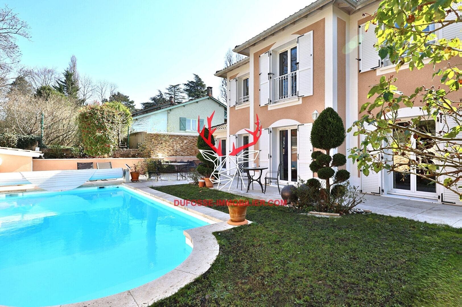 L'agence des Monts d'Or Dufossé Immobilier vous propose en Exclusivite cette maison de 4 chambres + 1 bureau, idéalement située dans une impasse au calme à la lisière de Saint-Cyr-au-Mont-d'Or, côté Lyon, sur les hauteurs du plateau de Saint-Rambert. Dans un environnement verdoyant, entourés d'arbres centenaires et d'essences rares, cette maison de plus de 168 m² séduit par la qualité de sa construction et sa luminosité omniprésente. Récemment rénovée avec soin, elle propose un agencement fluide et harmonieux. En rez-de-jardin, la pièce de vie, d'une superficie généreuse de 46 m², bénéficie de larges ouvertures sur le jardin plat, clos, et paysagé. Elle se compose de plusieurs espaces distincts, dont un salon chaleureux sublimé par une cheminée récente en marbre rose. La cuisine de plus de 15 m², semi-ouverte et entièrement équipée, s'articule autour d'un îlot central convivial, parfait pour les moments de partage. Côté nuit, la maison dispose de 5 chambres : - de plain-pied : 1 belle suite parentale, avec rangements, salle de bain spacieuse et terrasse. - à l'étage : 2 chambres + 1 bureau + 1 salon Tv offrant la possibilité de 4 chambres confortables, agrémentée de 2 salles d'eau rénovées et d'1 Wc séparé. Dans le jardin, une vaste terrasse de plus de 60 m² entoure une piscine rénovée de 8 m x 4 m, agrémentée de margelles en pierre naturelle et d'un volet motorisé. Le jardin, entièrement de plain-pied, et clos de murs, a été pensé pour profiter pleinement d'une vie extérieure simple et agréable, dans un environnement préservé de toute nuisance. Un garage attenant d'environ 30 m² offre rangements et praticité. Belles prestations avec une grande entrée, une belle hauteur sous plafond, de nombreuses ouvertures sur l'extérieur, un parquet en érable dans toutes les chambres, et une bonne performance énergétique. Aucun travaux à prévoir. La propriété offre un environnement particulièrement paisible, tout en restant proche de nombreuses commodités (Commerces, Ecoles, Restaurants, bus Tcl 2, 71, 20, Ecole de Musique, Tennis Club, Médiathèque, ..), le tout dans un environnement résidentiel recherché des Monts d'Or. Implantée dans un ensemble résidentiel confidentiel de 4 maisons individuelles, la propriété bénéficie d'un cadre clos et sécurisé. Plus de photos et dossier complet auprès d'Alice Patonnier : Copropriété de 4 lots - dont 4 lots habitation. (Pas de procédure en cours). Charges annuelles : 30.00 euros.