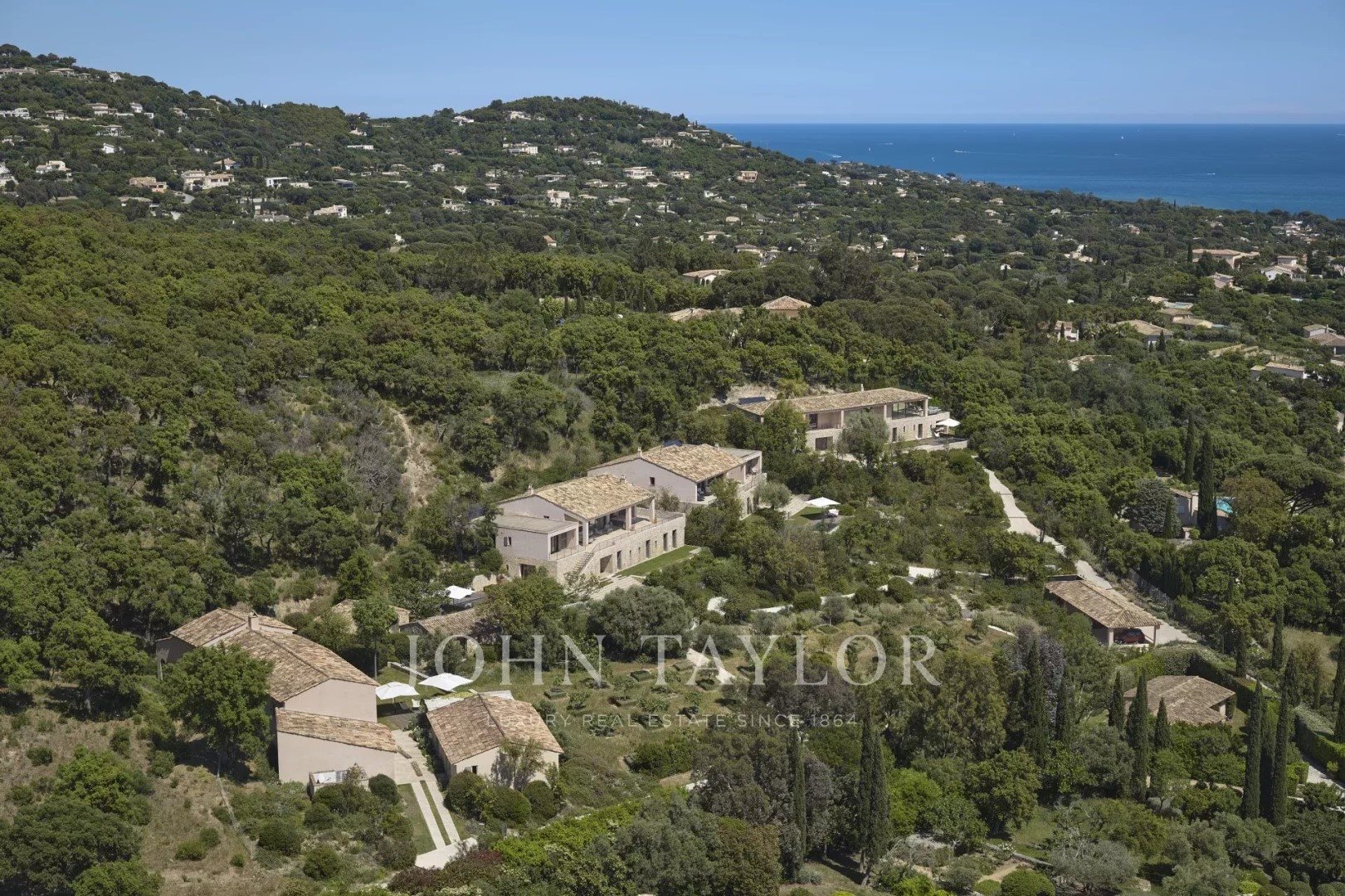 C'est au cœur du Golfe de Saint-Tropez, à la lisière de la forêt des Maures, que l'on peut découvrir ce lieu d'exception. Le domaine s'étend sur 7 hectares et dispose de 25 chambres réparties dans 5 grandes maisons. Cette propriété offre de nombreuses terrasses et jardins d'où l'on peut admirer la Méditerranée, ainsi qu'un vaste pool house devant l'immense piscine, lieu idéal pour se retrouver en famille et amis. Construite dans un esprit familial autour d'un verger, chaque maison dispose d'un salon intérieur et extérieur, ainsi que d'une piscine privative. Maison La Ferme : Au rez-de-chaussée : un vaste séjour, une cuisine, un coin repas, une buanderie avec cave à vin et un cellier. Au premier étage : quatre chambres avec vue sur mer, chacune avec un lit queen-size (dont trois convertibles en lits jumeaux), une salle de bains privative et des toilettes séparées. Annexe de la Maison La Ferme : Cet espace de plain-pied comprend un séjour avec télévision donnant sur une terrasse extérieure avec coin repas et une piscine de six mètres à fond mobile. Il dispose de deux chambres avec vue sur mer, chacune avec deux lits queen-size (pouvant être réunis en lits jumeaux), partageant une salle de bains avec douche et des toilettes adaptées aux personnes à mobilité réduite. Maison Carbonnelle : Au rez-de-chaussée : quatre chambres, chacune avec salle de douche privative, une buanderie et des toilettes séparées. Au premier étage : un séjour avec coin repas, un second séjour avec grande télévision, une cuisine, une buanderie avec cave à vin, une suite parentale avec salle de bains privative (baignoire et douche), toilettes séparées et un bureau spacieux avec terrasse privative et vue sur mer. Tous les lits de cette maison mesurent 160 cm et sont convertibles en lits jumeaux. Le Cabanon Bleu et Le Cabanon Rose : Ces charmants petits logements partagent plusieurs terrasses communes et une piscine de six mètres à fond mobile. Chaque chambre dispose d'un lit de 160 cm convertible en lits jumeaux. Le Cabanon Bleu : Deux chambres, une salle de douche séparée et des toilettes séparées. Le Cabanon Rose : Une chambre avec salle de douche et toilettes privatives. Maison Terre Brune : Au rez-de-chaussée : cinq chambres avec salle de bains privative, dont deux avec lit king-size, plusieurs toilettes privatives ou partagées, une salle de bains invités et une buanderie. Au premier étage : un grand salon avec télévision, un salon avec coin repas, une cuisine entièrement équipée et une buanderie. À ce même étage : la chambre principale avec salle de bains privative (baignoire et douche), des toilettes séparées, un bureau spacieux avec un lit d'appoint et télévision, et un accès à une terrasse privée avec vue sur la mer. Tous les lits sont convertibles en lits jumeaux. La villa dispose également d'une piscine de six mètres à fond mobile et de deux terrasses. Maison Solsequia : Au rez-de-chaussée : quatre chambres (avec des lits de 160 cm, tous convertibles en lits jumeaux), chacune avec salle de bains privative (dont une adaptée aux personnes à mobilité réduite), et plusieurs toilettes. Au premier étage : un vaste séjour avec télévision, un séjour avec coin repas et vue mer, une cuisine entièrement équipée et une buanderie, une élégante verrière intérieure et la suite parentale avec deux salles de bains (l’une avec baignoire, l’autre avec douche et Wc séparés), un bureau attenant et un accès à une terrasse privée avec vue mer. Cette villa dispose également d’une piscine à fond mobile de six mètres et de deux terrasses. Le Pool House : un espace exceptionnel de 150 m² dédié à la détente : un grand séjour avec coin repas, un salon supplémentaire modulable, une cuisine et une buanderie, des vestiaires avec douches et Wc, ainsi qu’une pièce attenante de 40 m². Profitez de la piscine chauffée de 20 mètres et de la terrasse sur le toit offrant une vue imprenable sur la mer. Plusieurs terrasses, aménagées avec du mobilier de jardin et un coin repas extérieur, sont idéales pour savourer des repas grâce à la plancha et au four à bois. Cet espace est également parfait pour recevoir, avec une salle de loisirs dédiée comprenant un baby-foot, une table de ping-pong et des enceintes Bluetooth Sonos. Toutes les maisons sont équipées de la climatisation et du Wi-Fi.
