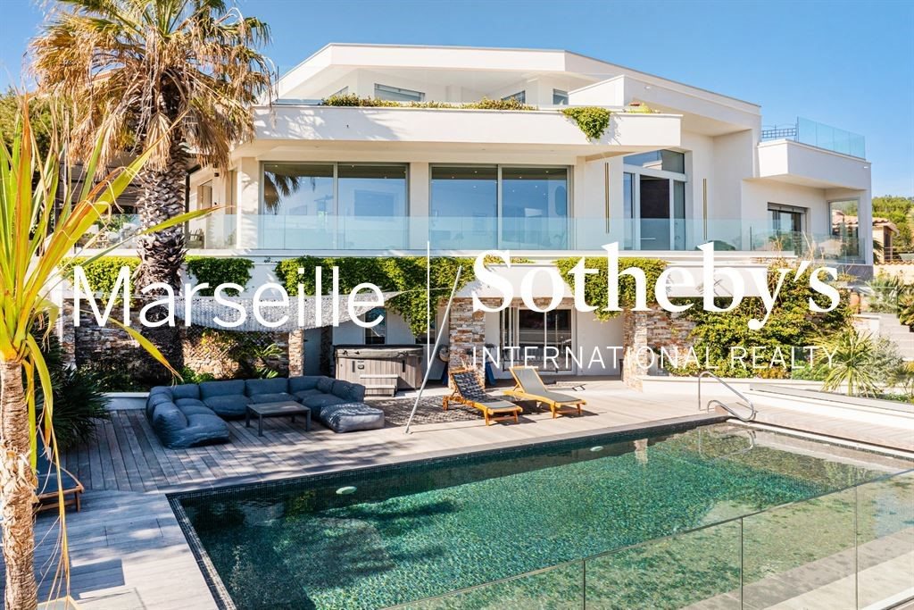 À vendre à Carry-le-Rouet, maison contemporaine d'architecte avec vue spectaculaire sur la mer, piscine, cinq chambres et accès privatif à l'eau. Implantée sur une parcelle de 1 376 m², cette propriété d'exception bénéficie d'une superficie totale de 412 m², dont 381 m² de surface habitable. Les pieds dans l'eau, elle offre un panorama à couper le souffle sur l'horizon marin. Dès l'entrée, la luminosité exceptionnelle des espaces de vie vous séduira, sublimée par de larges baies vitrées s'ouvrant directement sur la mer. Répartie sur trois niveaux desservis par un ascenseur privatif, la maison propose des prestations haut de gamme pour un confort de vie incomparable. Le premier niveau accueille un vaste séjour de 80 m² prolongé par des terrasses panoramiques, une cuisine séparée, un bureau et une superbe suite parentale. À l'étage supérieur, vous découvrirez quatre chambres supplémentaires, dont une seconde suite parentale avec terrasse privative et vue imprenable. L'extérieur invite à la détente avec une somptueuse piscine, un jacuzzi, une cuisine d'été et un terrain de pétanque, créant un véritable espace de convivialité face à la mer. Pour compléter ce bien d'exception, une dépendance de 46 m² équipée d'une salle de sport, ainsi qu'un garage fermé de 100 m², offrent des prestations supplémentaires idéales. Enfin, l'accès privatif direct à la mer confère à cette propriété un caractère rare et unique.