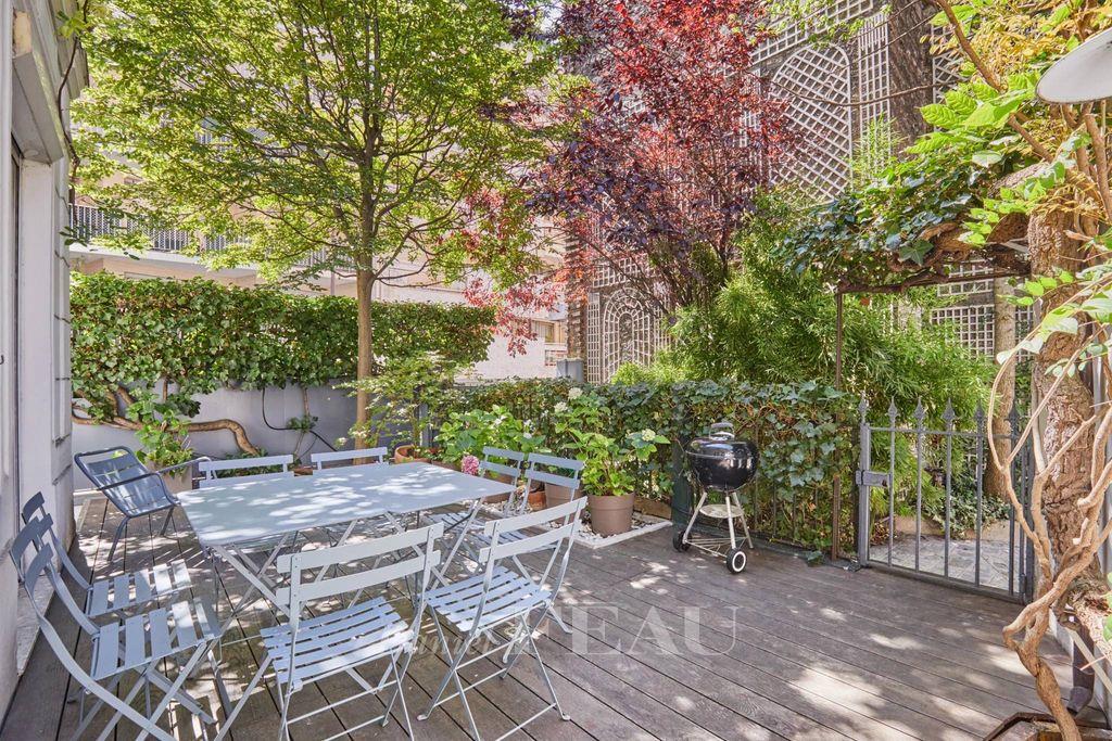 Auteuil South. This delightful near 120 sqm property benefiting from a leafy near 30 sqm patio is located in a peaceful street near the shops. It includes a ground-floor south-west facing living/reception room with a fireplace, two first floor bedrooms with a bathroom, and a top-floor master suite with a bathroom, a dressing room and a wc. The half-basement comprises a fully equipped kitchen with dining facilities, a utility room and a separate wc. A parking space in the opposite building may be acquired at extra cost.