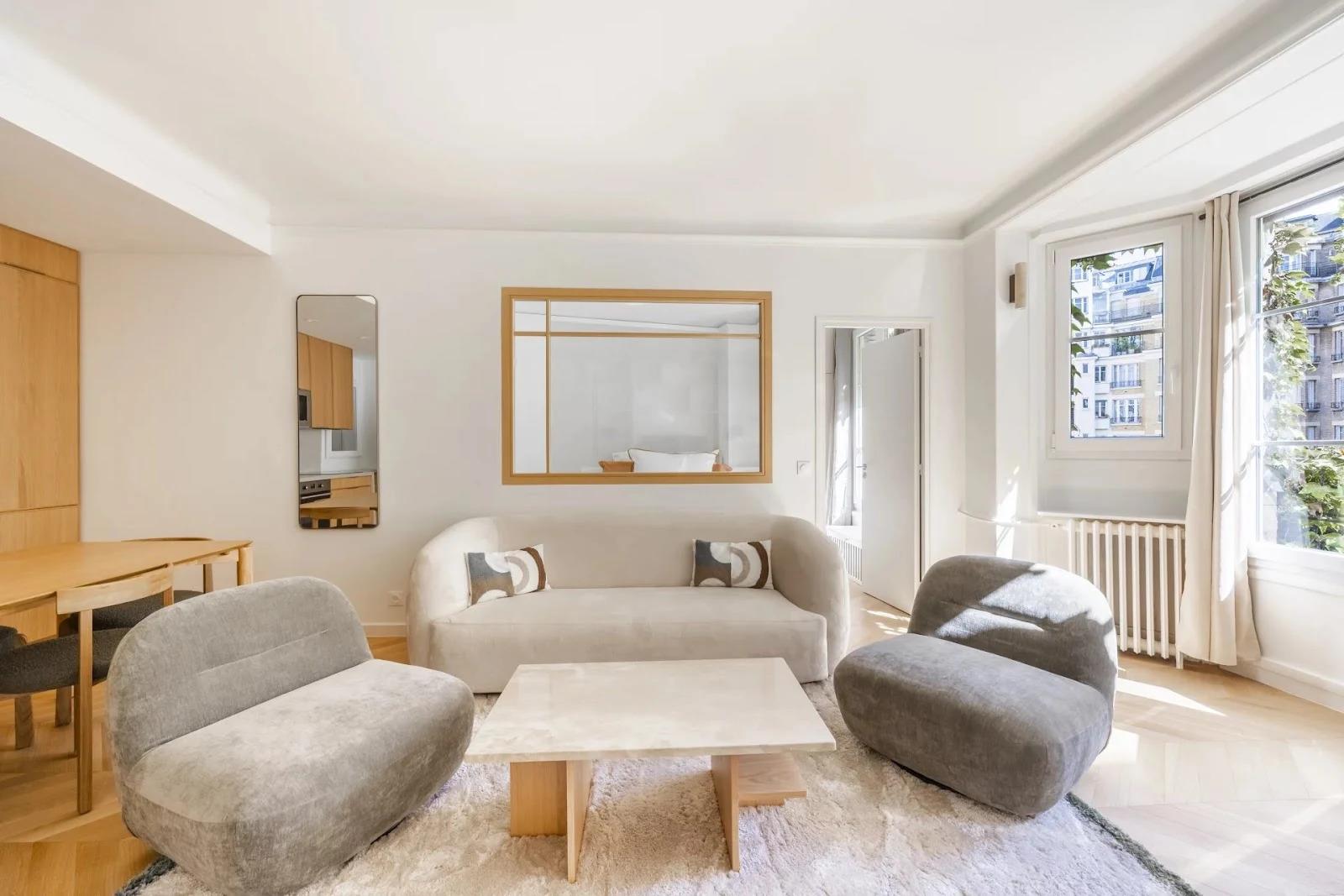 Au sein d’un bel immeuble Art Déco, sécurisé avec gardienne et ascenseur, joli deux-pièces de 48 m² (loi Carrez), entièrement rénové avec des matériaux de qualité. L’appartement se compose d’un vaste séjour lumineux avec cuisine américaine équipée (lave-vaisselle, lave-linge, four, micro-ondes…), agrémenté d’un coin bureau et d’une bibliothèque sur mesure. Il offre une vue dégagée, au calme. La chambre, élégante et confortable, bénéficie de sa salle de bains attenante. Nombreux rangements et toilettes invités viennent parfaire ce bien rare. Bail meublé Loyer charge comprise : 2 300 € par mois Honoraires d’agence : 720 € Pour tout renseignement et pour organiser une visite, contactez Catherine ou par e-mail à l’adresse suivante :