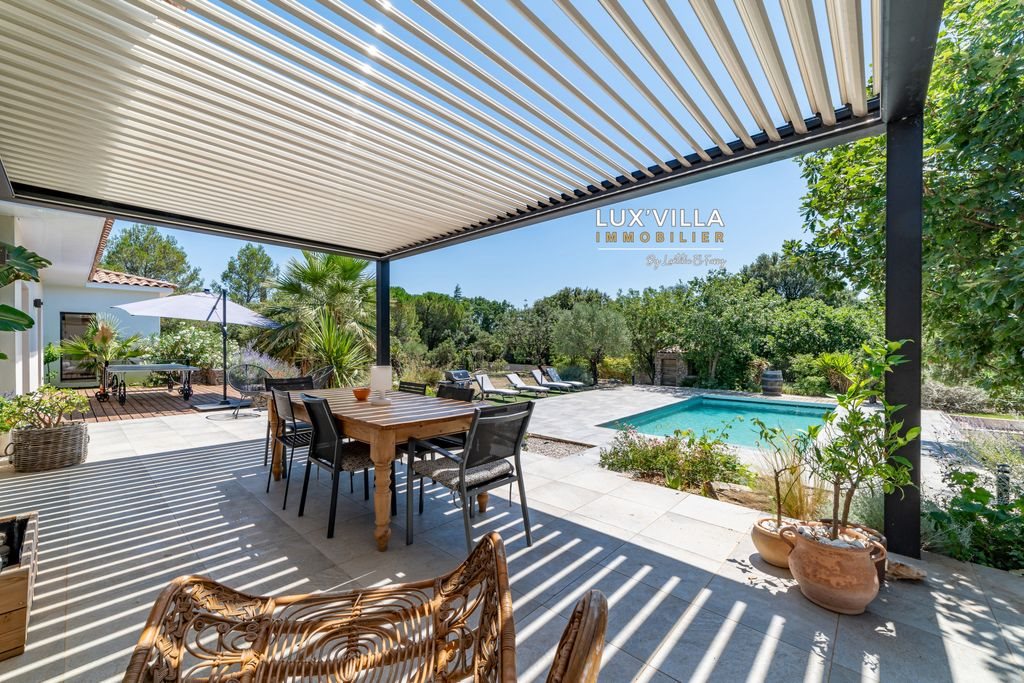 Nestled in the heart of a private and secluded environment, 8 minutes from St Gely du Fesc and 25 minutes from Montpellier , this rare and exclusive property offers 290 m2 of living space on a magnificent landscaped plot of 3,000 m2 . Its contemporary single-storey architecture and its unique configuration as two independent villas make it an exceptional property, offering a remarkable lifestyle and great freedom of use. Designed to meet the most demanding expectations, the property is equally suited as a primary family residence , for hosting relatives in complete privacy , or as a high-end rental project . The main villa, spanning 195 m2, impresses from the moment you enter with its generous proportions and abundant natural light, thanks to large windows opening onto the outside. It features an elegant entrance with built-in storage, a stunning open-plan living area with clean lines encompassing a kitchen, living room, and dining room, as well as a discreet and functional utility room/laundry room. A home office completes the layout, ideal for working from home or running a freelance business. The sleeping area comprises four bedrooms, including a refined master suite and a bedroom with an en-suite shower room, as well as a flexible open space that can be converted into a gym, wellness area, or games room. Completely independent, the second villa, measuring 95 m2, is a true asset. It offers a pleasant living area with an open-plan kitchen, two bedrooms, a bathroom, a separate toilet, and an office. Perfect as a guest house, self-contained family accommodation, or premium rental property, it guarantees complete privacy between the two dwellings. The meticulously landscaped grounds offer a lifestyle in harmony with nature, featuring a secure garden, lounge areas and shaded corners, a pétanque court, and a large terrace with a bioclimatic pergola overlooking the pool. The 8 x 4 m pool, equipped with a submerged cover and a heat pump, allows for comfortable use in all seasons. The property also features a garage and easy parking that can accommodate up to five additional vehicles. This unique property in the area, with its rare configuration of two single-storey villas, is appealing due to its quality features, meticulous finishes and quiet, residential environment with no overlooking neighbors, offering strong heritage and rental potential. Property handled and written by Laetitia El Fassy Lux'villa Immobilier Sole Proprietor, Real Estate Agent Rsac Montpellier