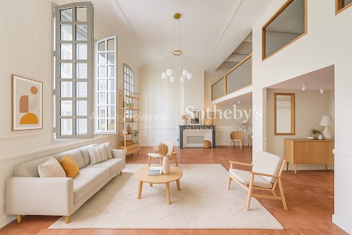 For Sale – 149.5 m² total floor area (135 m² Carrez law) – Elegant renovated apartment in the heart of the city center Located in a magnificent 17th–18th century private mansion, fully restored and refurbished in 2024 (renovated façade, new roof, refurbished interiors), this superb first-floor apartment with elevator offers 149.5 m² of total floor area (135 m² Carrez law) and beautifully combines historic charm with modern comfort. The apartment impresses with its high ceilings, perfectly preserved traditional terracotta tiles, elegant moldings, and abundant natural light that enhances every room. This rare property offers a harmonious balance between historical character and contemporary amenities: air conditioning, double glazing, bespoke storage, optimized layout, and refined finishes. The spacious and welcoming living area features remarkable volume, allowing for a convivial yet sophisticated atmosphere. The kitchen, both functional and stylish, blends seamlessly into the space and invites enjoyable moments of sharing. The night area includes two bedrooms, one of which is a master suite with its own shower room. An additional bathroom and a second independent shower room complete the layout for optimal comfort. On the mezzanine, a bright office area can easily be converted into a third bedroom as needed. The property also benefits from a large shared cellar within the building, as well as a private cellar. Situated on a quiet street just steps from shops, schools, and restaurants, this apartment enjoys a privileged location at the heart of Aix-en-Provence’s vibrant lifestyle. The layout also makes it suitable for a commercial activity or a liberal profession. A rare opportunity, not to be missed. Mandate 1477 – Contact: Sophie Aubert – Independent Sales Agent – Aix-en-Provence Sotheby’s International Realty, the reference for luxury real estate in Aix-en-Provence.