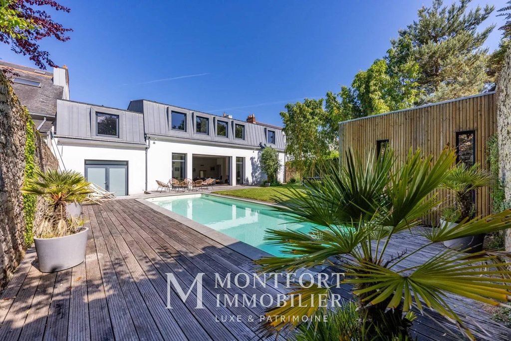 New Development / Montfort Immobilier Luxe & Patrimoine Nantes - La Baule - PORNIC Ideally located in the sought-after Mellinet district of Nantes, this family home offers an exceptional living environment, in the heart of a quiet, discreet setting, yet close to shops, schools and transport. Completely renovated between 2008 and 2010 by a renowned architect, it elegantly combines modern comfort and spaciousness in a resolutely contemporary style. With 284 m² of living space (291 m² floor area), it is spread over two spacious, perfectly laid-out levels. Upon entering, you'll be greeted by a vast hall with checkroom and guest toilet. The generous living area, bathed in natural light, includes a lounge with fireplace, dining room and a large, fully-equipped open kitchen, perfect for entertaining. The first floor is also home to a beautiful master suite, offering an independent and comfortable living space. This includes a spacious master bedroom, a fitted dressing room, a bathroom with bath and shower, and a separate toilet. A 44 m² double garage, directly accessible from inside the house, completes this level. It also incorporates a laundry and boiler room, optimizing technical spaces. Upstairs, the landing has been converted into a study and leads to four additional large bedrooms, including a new suite with dressing room and private bathroom with shower and separate toilet. A shower room with toilet also completes this level. Outside, you'll find a landscaped garden facing southwest, entirely enclosed by stone walls, guaranteeing perfect privacy. A swimming pool with submerged cover blends harmoniously into this relaxing space. At the far end of the plot, a 15 m² outbuilding, used as a pool house, completes the exterior features with shower and toilet. This exceptional property boasts generous volumes, absolute peace and quiet with no overlooked neighbours, and top-of-the-range amenities. Selling price €1,490,000 including 4.56% agency fees, net selling price €1,425,000. Presentation file on request. Energy class: B Climate class: A Estimated annual energy costs for standard use: between €1,640 and €2,250 per year. Average energy prices indexed to January 1, 2021. Information on the risks to which this property is exposed is available on the Géorisques website: État des risques et pollution: réalisé (null)