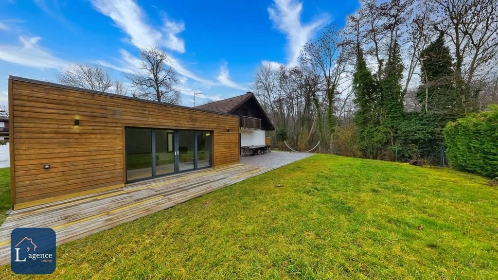 Maison Individuelle T5 3 Chambres Extension 2018 Fond D'impasse Jardin Piscinable Parcelle 1 025 M² Versonnex 01210Bienvenue chez L'agence Immo, votre partenaire immobilier de confiance.Mélanie Gueyffier vous présente en exclusivité cette maison individuelle T5 construite en 1980, édifiée sur une parcelle de 1 025 m², idéalement située au fond d'une impasse à Versonnex. Elle dispose de trois chambres dont une au rez-de-chaussée, d'une extension réalisée en 2018 offrant un grand séjour lumineux, d'une cuisine indépendante, d'une salle de bains, d'une salle d'eau, de deux Wc, d'un balcon, d'un garage en longueur, de terrasses et d'un jardin clos piscinable avec de nombreux stationnements privatifs.Aménagement intérieurLa maison se compose au rez-de-chaussée d'une entrée desservant une cuisine indépendante aménagée et équipée, une salle à manger avec poêle à bois, une chambre avec grand placard intégré, une salle de bains et un Wc indépendant. Un dégagement mène ensuite au vaste séjour issu de l'extension réalisée en 2018, créant un espace de vie lumineux et ouvert sur l'extérieur.La cuisine bénéficie d'un accès direct au garage en longueur, apprécié pour sa belle hauteur sous plafond.À l'étage, deux grandes chambres disposent de rangements intégrés dans les sous-pentes. L'une bénéficie d'un petit dressing et d'un balcon privatif. La seconde, plus spacieuse, offre également des placards aménageables en sous-pente et peut être divisée afin de créer deux chambres supplémentaires selon les besoins. Une salle d'eau avec Wc complète ce niveau.Aménagement extérieurLa propriété est entièrement clôturée et équipée d'un portail motorisé. Elle dispose de terrasses, d'un jardin d'environ 600 m² exposé Sud et d'un terrain piscinable. Le cadre est particulièrement calme, sans nuisance.Plusieurs stationnements sont possibles au sein de la parcelle, en complément du garage.Prestations et équipementsCertaines menuiseries d'origine sont en bois double vitrage, tandis que l'extension bénéficie de menuiseries aluminium en triple vitrage. La toiture principale est à quatre pans et l'extension dispose d'un toit plat végétalisé.Le chauffage est individuel électrique et complété par un poêle à bois installé dans la salle à manger. La maison est raccordée au tout-à-l'égout et dispose de la fibre optique. La ventilation est assurée par une Vmc simple flux et l'extension est équipée de brise-soleil orientables motorisés Somfy.Localisation et commoditésSituée à Versonnex 01210, la maison bénéficie d'une proximité immédiate avec la frontière franco-suisse, Genève et le canton de Vaud, ce qui en fait une adresse idéale pour les frontaliers.La ligne Tpg 52 reliant Versonnex à Genthod facilite les déplacements vers la Suisse. La commune dispose d'écoles, de commerces de proximité, d'une maison médicale, de services et d'infrastructures sportives accessibles rapidement.Informations complémentairesLa maison fait partie d'un lotissement en Asl sans charges.La taxe foncière s'élève à 907 par an.Le Dpe réalisé le 12 février 2026 classe le bien en D pour la consommation énergétique et en B pour les émissions de gaz à effet de serre. Les dépenses annuelles d'énergie sont estimées entre 2 230 et 3 060 (années de référence 2021, 2022 et 2023).La maison a bénéficié de travaux récents, notamment l'extension de 2018 et certains aménagements. Des travaux de r...