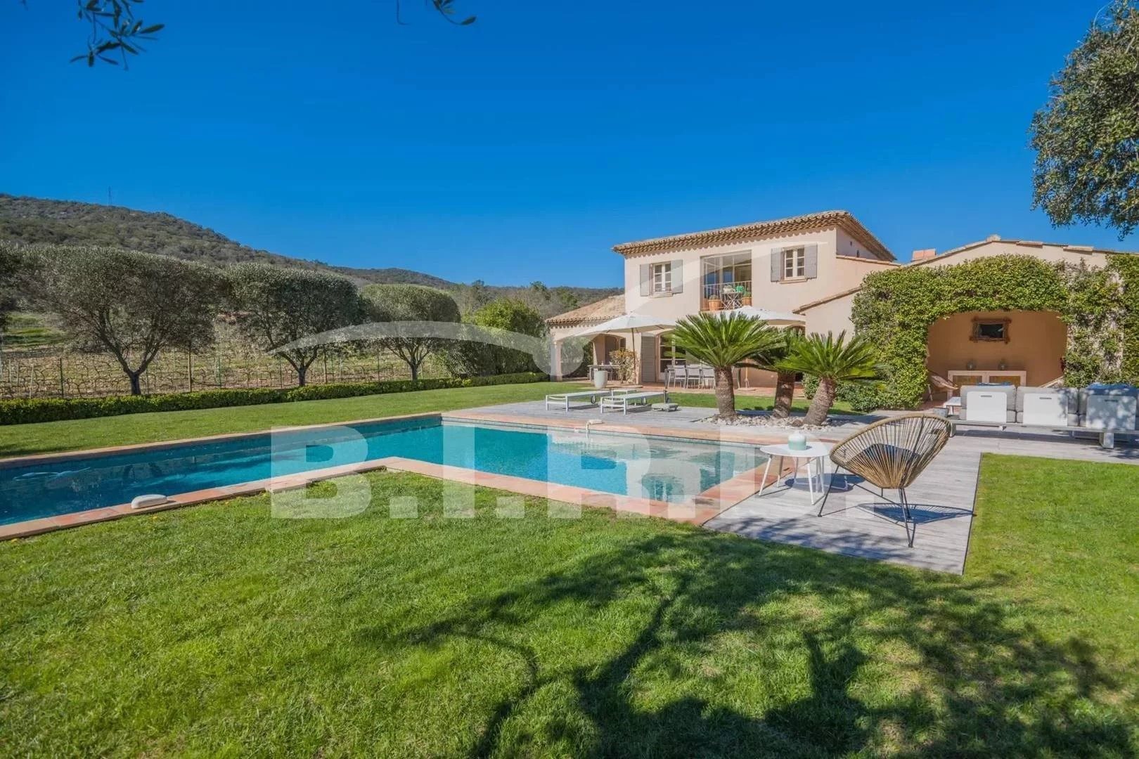 Nous vous proposons pour vos vacances à Grimaud, cette magnifique Bastide de 220 m² nichée sur un grand terrain plat, alliant harmonieusement le charme de l'ancien au contemporain. Elle se compose de plain-pied : un vaste séjour lumineux s'ouvrant sur la terrasse et la piscine, une grande cuisine ouverte et entièrement équipée (avec four micro-ondes, four, réfrigérateur et machine à café), 1 chambre avec un lit de 160x200cm et une salle d'eau. A l'étage, 3 chambres (lits : 160 x 200 cm) avec leurs salles de bains/douches attenantes, dont 1 chambre de maître avec un lit de 180 x 200 cm et sa terrasse privée offrant une vue imprenable sur la piscine et le jardin. À l'extérieur, une cuisine d'été avec son barbecue au gaz, une grande piscine de style balinaise invite à la détente. Une buanderie équipée d'un lave-linge et d'un sèche-linge, ainsi que des places de parking dans la propriété complète lensemble. Un lieu unique au calme au milieu de la nature et des vignes. Un petit havre de paix. Les Plus : Climatisation dans les chambres à l'étage et dans les pièces de vie, Wi-Fi, Table de ping pong, barbecue au gaz.. Visite virtuelle sur demande ! Capacité daccueil : 8 personnes Check-in/out en haute saison : du Samedi au samedi A régler sur place : taxe de séjour et dépôt de garantie Numéro d'enregistrement :