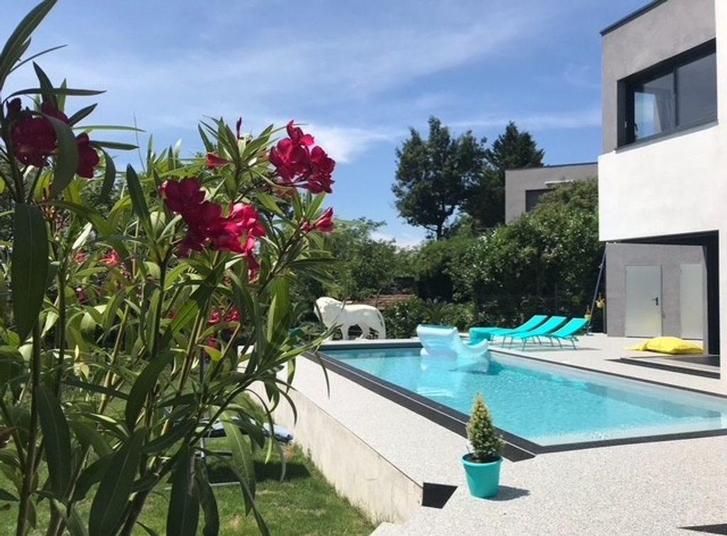 Cette maison contemporaine de 168 m2, édifiée en 2017, offre un cadre de vie privilégié où se conjuguent volumes généreux, luminosité et prestations soignées. Implantée au calme absolu, en fond d’impasse, elle bénéficie d’un environnement préservé, sans nuisances, avec très peu de vis-à-vis et une vue panoramique dégagée, véritable signature du bien. Le rez-de-chaussée s’organise autour d’une vaste pièce de vie d’environ 70 m2, baignée de lumière grâce à de larges baies vitrées entièrement ouvrantes, créant une continuité naturelle entre intérieur et extérieur. L’Orientation sud-est assure un ensoleillement optimal tout au long de la journée. La cuisine ouverte, entièrement équipée, s’intègre harmonieusement à l’espace et invite à une vie conviviale au quotidien. À ce niveau, une pièce de 17 m2, avec accès direct à la terrasse, offre une grande modularité d’usage : chambre de plain-pied, bureau ou espace loisirs (actuellement aménagée en salle de billard). À l’étage, l’espace nuit accueille quatre chambres, dont une superbe suite parentale d’environ 30 m2, disposant de sa salle de bain privative et d’une terrasse avec vue dégagée. Les trois autres chambres bénéficient chacune d’un accès à une salle d’eau indépendante, garantissant confort et fonctionnalité pour toute la famille. Les extérieurs, soigneusement aménagés, constituent un véritable atout. La terrasse accueille une piscine élégante, parfaitement intégrée dans son environnement, offrant une vue panoramique exceptionnelle et une atmosphère résolument paisible. L’Ensemble est pensé pour profiter pleinement des beaux jours, dans un cadre intime et privilégié, propice à la détente comme à la réception. Sur le plan technique, la maison bénéficie de prestations énergétiques performantes, avec une pompe à chaleur air/eau associée à un plancher chauffant, complétée par une pompe à chaleur air/air assurant la climatisation, ainsi que des menuiseries en double vitrage à isolation renforcée. Ces équipements confèrent au bien un excellent niveau de performance énergétique Dpe A, rare sur le marché de la maison individuelle, garantissant confort thermique et maîtrise des consommations. Cette propriété moderne et élégante a été conçue pour offrir un confort de vie optimal, tant par la qualité de ses volumes intérieurs que par la mise en valeur de ses espaces extérieurs, dans un environnement rare et recherché. État des risques et pollution: Oui