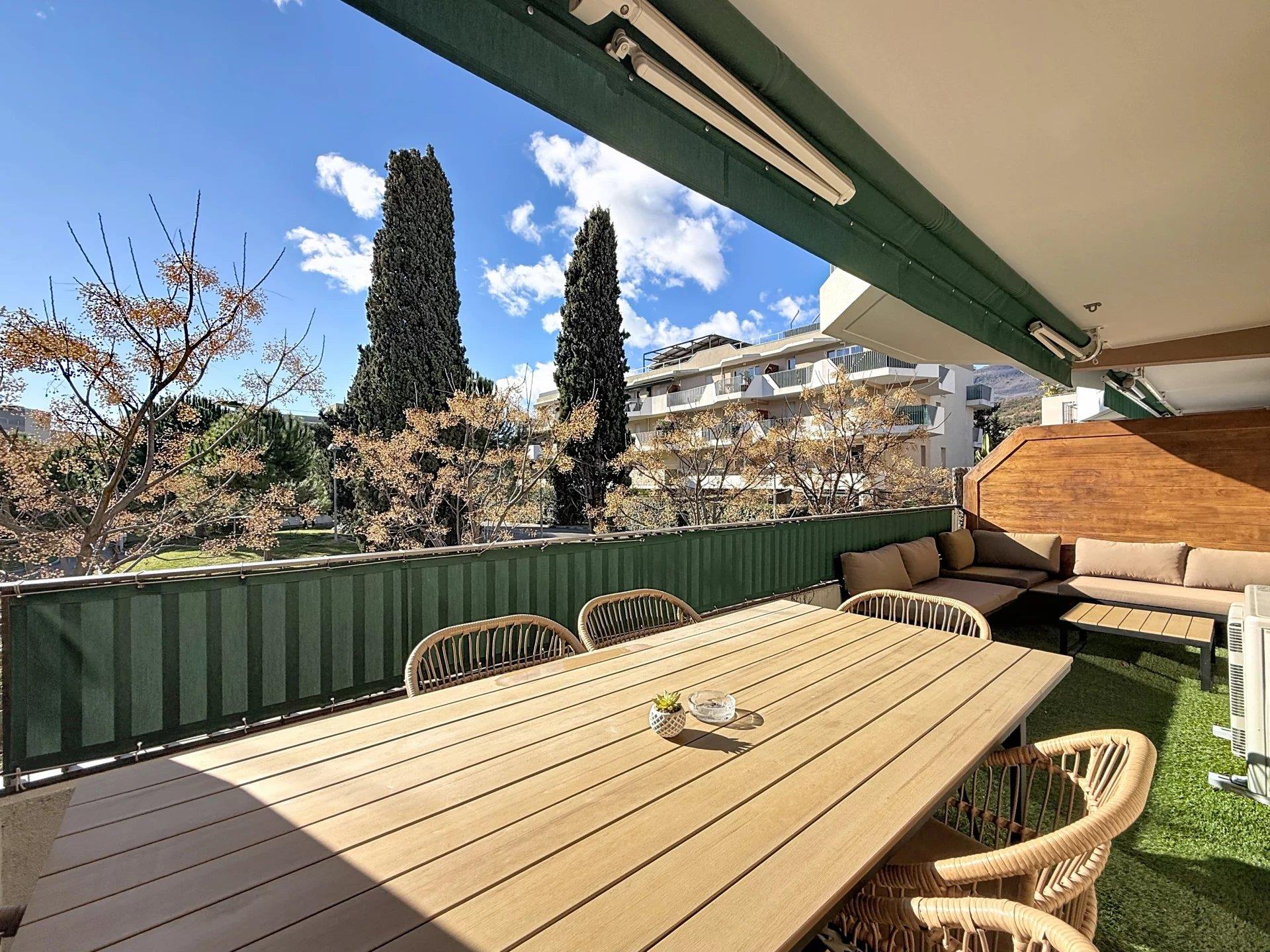 Dans une résidence calme et bien entretenue, ce deux pièces se compose d'une entrée avec placard, d’une agréable pièce à vivre climatisée d’environ 18 m² avec cuisine équipée ouverte sur le séjour, le tout s’ouvrant sur une grande terrasse de 16 m² exposée Plein Sud sans vis-à-vis, offrant une vue dégagée sur la verdure. Côté nuit, une chambre de 11 m², également climatisée, avec placard intégré et accès extérieur. La salle d’eau moderne dispose d’une douche à l’italienne et de WC. Prestations confortables : volets roulants électriques, double vitrage, store banne motorisé. Le bien est vendu avec un double parking en enfilade. La copropriété propose de nombreux équipements : piscine, terrain de boules, jardin d’enfants, salle de réception ainsi que plusieurs places visiteurs. A deux pas de la copropriété vous y trouverez un supermarché ainsi qu'une école maternelle. Bien soumis au statut de la copropriété A visiter sans tarder!!