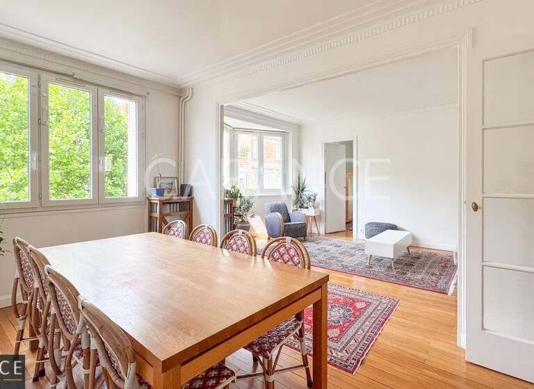 Au 5ème étage avec ascenseur, superbe appartement en Parfait État, traversant, avec tout le charme de l'ancien. Avec son plan en étoile, cet appartement comprend une entrée, un double séjour, une cuisine indépendante équipée, deux chambres, une salle d'eau. Wc séparés. Possibilité de faire une 3ème chambre. Vue dégagée sur verdure ! Une cave est rattachée à l'appartement. Agent commercial immobilier.
