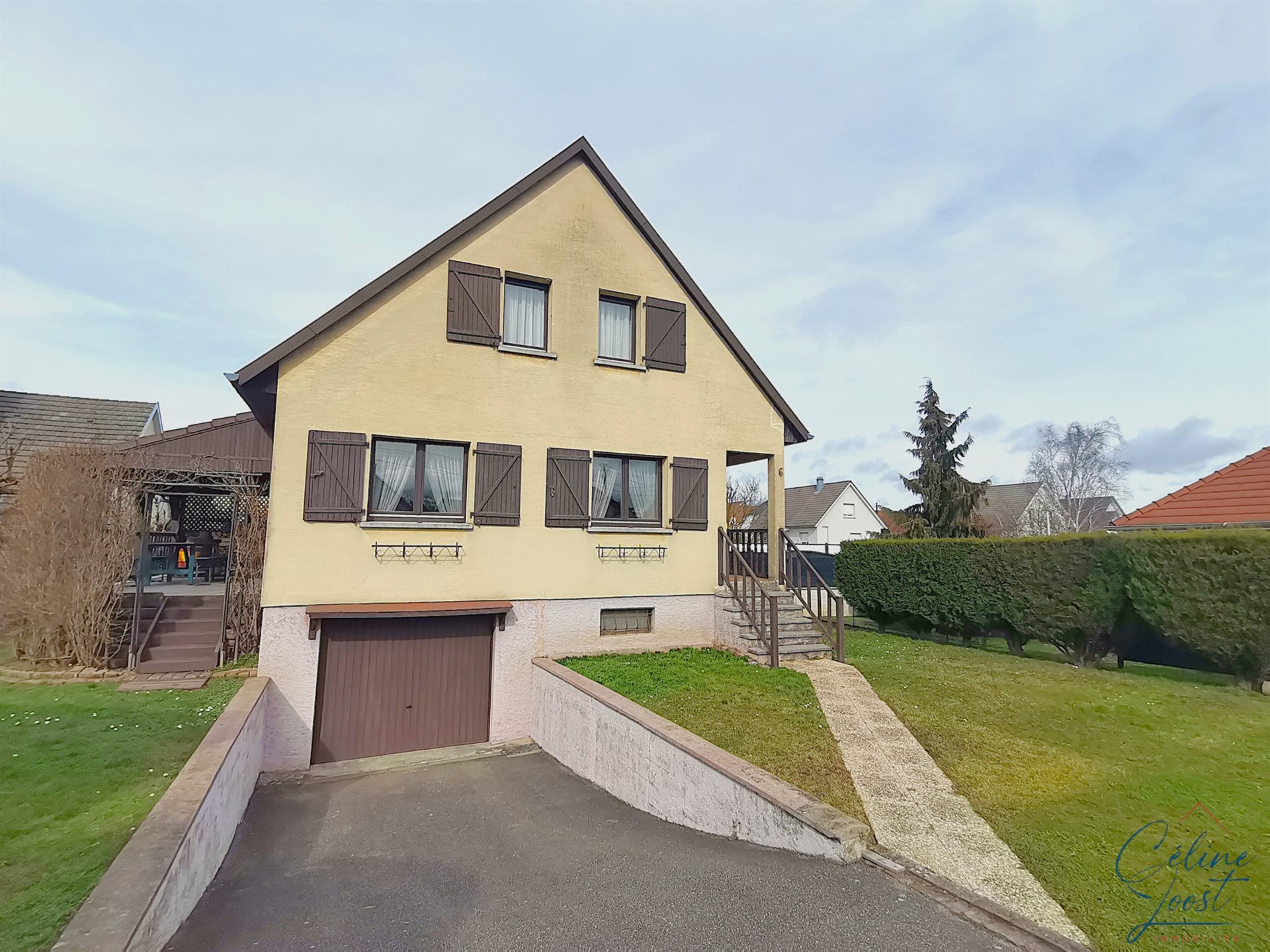 Votre agence Céline Joost Imobilier vous propose cette maison individuelle bâtie en 1986 et située au calme au sein d'un lotissement de la commune de Kingersheim. Bénéficiant d'une belle exposition, celle-ci se compose comme suit : au Rdc : une entrée avec dégagement, un salon/séjour avec accès à la terrasse couverte, une cuisine équipée séparée, une Sdb et un Wc séparé. Au 1er étage : un palier desservant 3 chambres. La maison dispose également d'un sous-sol complet composé d'un garage et de différentes pièces. La maison de 99 m2 hab. Est entièrement clôturée et un jardin arboré complète l'ensemble. Concernant les aspects techniques : fenêtres double vitrage en bois, chauffage par cheminée bois et convecteurs électriques, production d'eau chaude par ballon électrique. Belle opportunité pour ce bien situé proches des axes principaux et de toutes commodités !