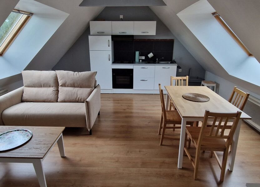 Appartement de 27,51m² habitable (54,13m² au sol) À Louer en meublé. Un appartement de type 3, en, Meuble, au deuxième étage, composé de : Une grande pièce de vie avec cuisine aménagée et équipée (plaques, four et combiné réfrigérateur et congélateur), une chambre, un bureau avec canapé lit, une salle de bains (baignoire avec colonne de douche et WC. Une place de stationnement libre devant l'immeuble.