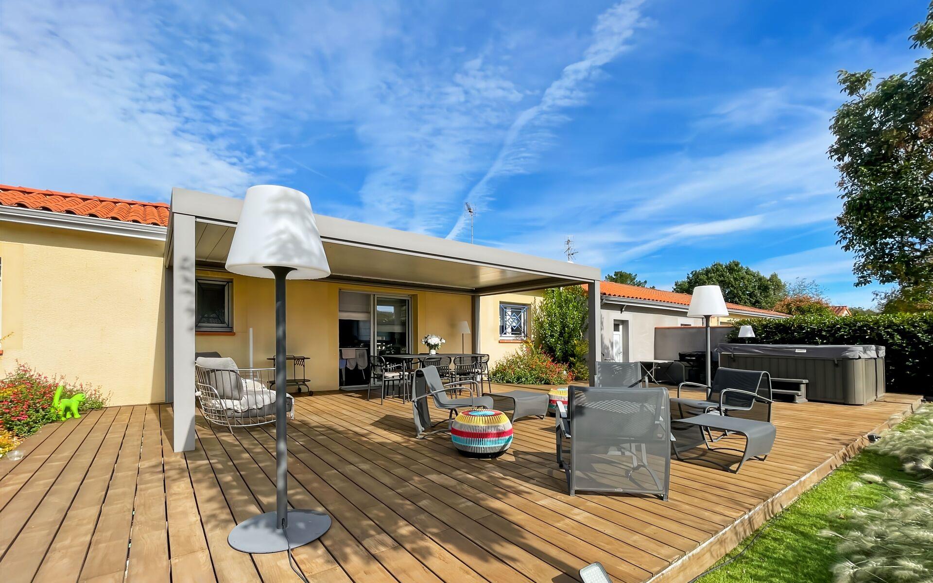 Maison À Vendre. À proximité de Launaguet et Aucamville, découvrez cette villa contemporaine de plain-pied entièrement rénovée, située dans un petit ensemble résidentiel sécurisé et au calme. Elle propose un vaste espace de vie lumineux de plus de 50 m² avec cuisine ouverte équipée, trois chambres dotées de rangements intégrés, ainsi que deux salles d’eau, dont une attenante à une chambre. Un garage isolé de 24 m² avec coin buanderie complète l’ensemble. Les finitions sont soignées : parquet en chêne massif, climatisation réversible, et équipements modernes. À l’extérieur, plusieurs terrasses en bois exotique avec pergola bioclimatique et stores intégrés prolongent l’espace de vie, accompagnées d’un jacuzzi, d’un terrain de pétanque et d’un jardin paysager de près de 600 m² avec arrosage automatique et pelouse synthétique. La résidence offre un cadre intimiste avec faibles charges et se situe à deux minutes des rocades, avec un arrêt de bus menant au métro Borderouge et des écoles à proximité. Bien vendu en pleine propriété.