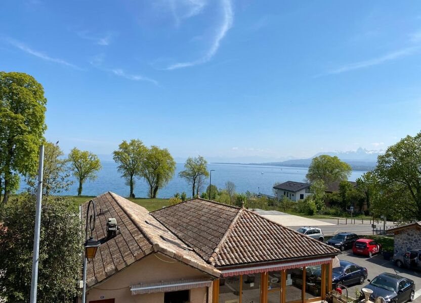 Vue Lac, T4 93 m². Idéalement situé en bordure du lac offrant une vue panoramique du Léman . A 30 minutes de Genève centre, ce bien comprend un séjour spacieux avec balcon donnant sur le lac, cuisine américaine neuve ouverte sur le salon. 3 vastes chambres avec balcon et une grande salle de bain. Libre à partir à du 10 Avril Avec Parking