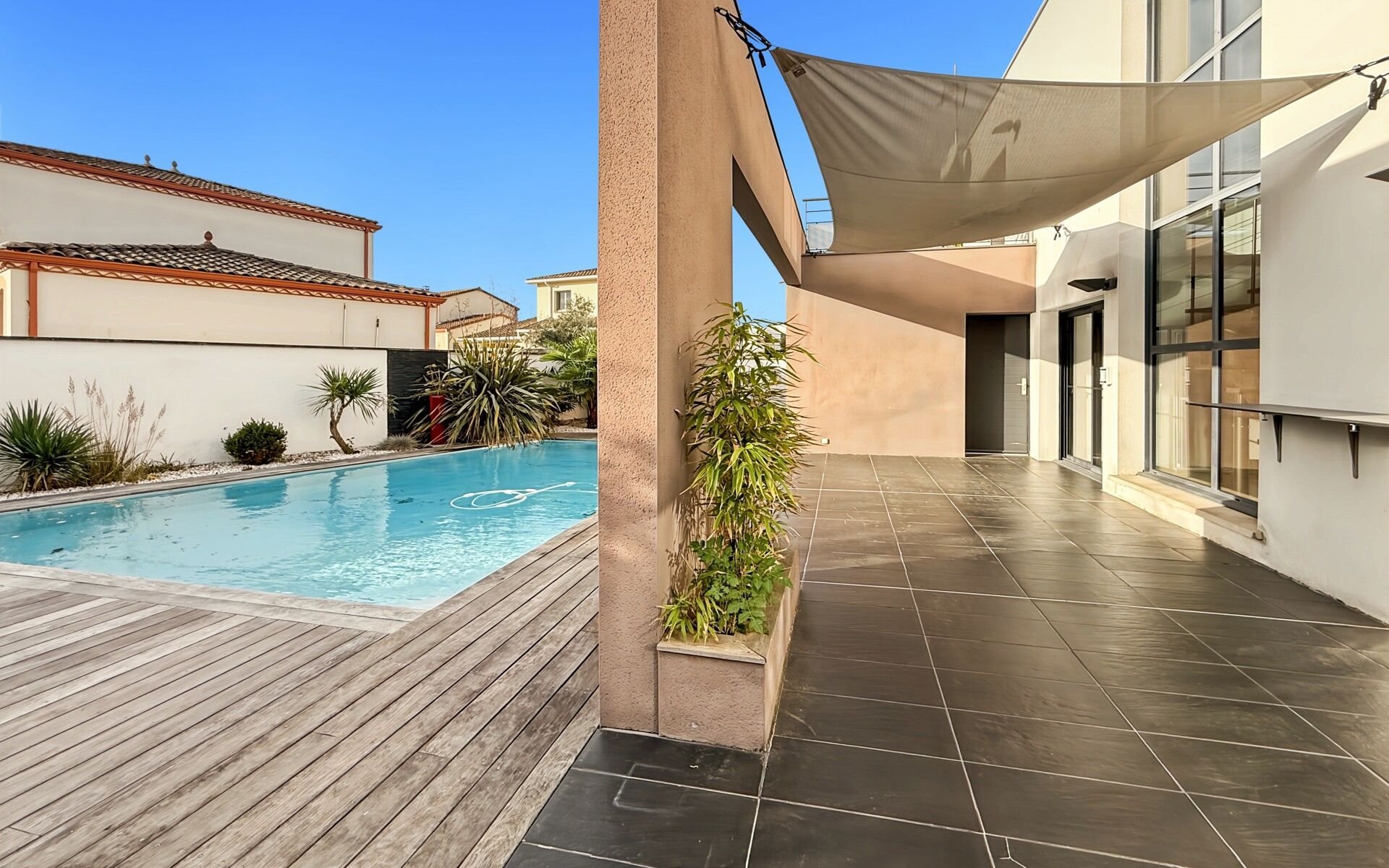 Magnifique maison d'architecte. À seulement 12 minutes du centre-ville, dans une voie privée calme et recherchée, découvrez cette magnifique maison d’architecte de 148 m², alliant modernité, confort et prestations haut de gamme. Dès l’entrée, vous serez séduit par la spacieuse pièce de vie baignée de lumière, ouverte sur une cuisine américaine signée Teisseire, pensée pour allier convivialité et élégance. Ces espaces s’ouvrent sur un extérieur soigné, où vous profiterez d’une terrasse couverte, d’une piscine chauffée et d’un jardin verdoyant à l’abri des regards. Le rez-de-chaussée dispose également d’un espace buanderie, de toilettes et d’un grand garage double pouvant accueillir jusqu’à deux véhicules. À l’étage, l’espace nuit propose quatre chambres dont deux avec rangements intégrés, une suite parentale avec salle d’eau et dressing, ainsi qu’une grande chambre de plus de 20 m² bénéficiant d’une superbe terrasse de 17 m². Le tout est équipé de la climatisation dans chaque pièce, garantissant un confort optimal toute l’année. Un bien rare sur le secteur, alliant design, fonctionnalité et sérénité, à proximité immédiate du métro et du périphérique.