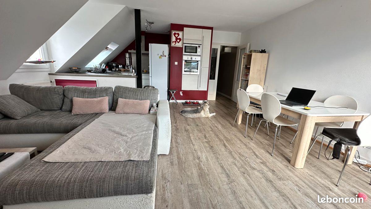 Beau 4 pièces - 95 m2 avec terrasse sans vis-à-vis - proche Colmar centre et commerces (74 m2 loi Carrez). Loyer 1.150 € / mois + 110 € de provisions sur charges (charges communes de copro, eau froide et entretien chaudière). Non meublé. Dpe : C Dans une résidence récente et bien entretenue. Situé au 3e et dernier étage avec ascenseur. Superbe vue sur les Vosges (Haut-Koenigsbourg, Trois-Epis, Galtz) depuis une terrasse de 13 m², équipée d’un store motorisé. Situation calme, à 10mn du centre ville à pied. A 5mn à pied de la cité administrative. Entrée - dégagement - placard mural. Cuisine meublée et équipée ouverte sur lumineux séjour donnant accès direct à la terrasse. 2 chambres d’environ 10 m² chacune avec placard mural, 1 chambre d’environ 13 m². Salle de bains, wc séparés. Chaudière individuelle au gaz remplacée en 2022. En annexes au sous-sol : box fermé, 1 place de parking et une cave. Local vélo partagé sécurisé. Interphone neuf (2025). Les avantages : économe en énergie (classe C), résidence calme et bien entretenue, sans vis-à-vis. Revenus minimums exigés : 3600 € / mois Me pour de plus amples renseignements et pour une visite.