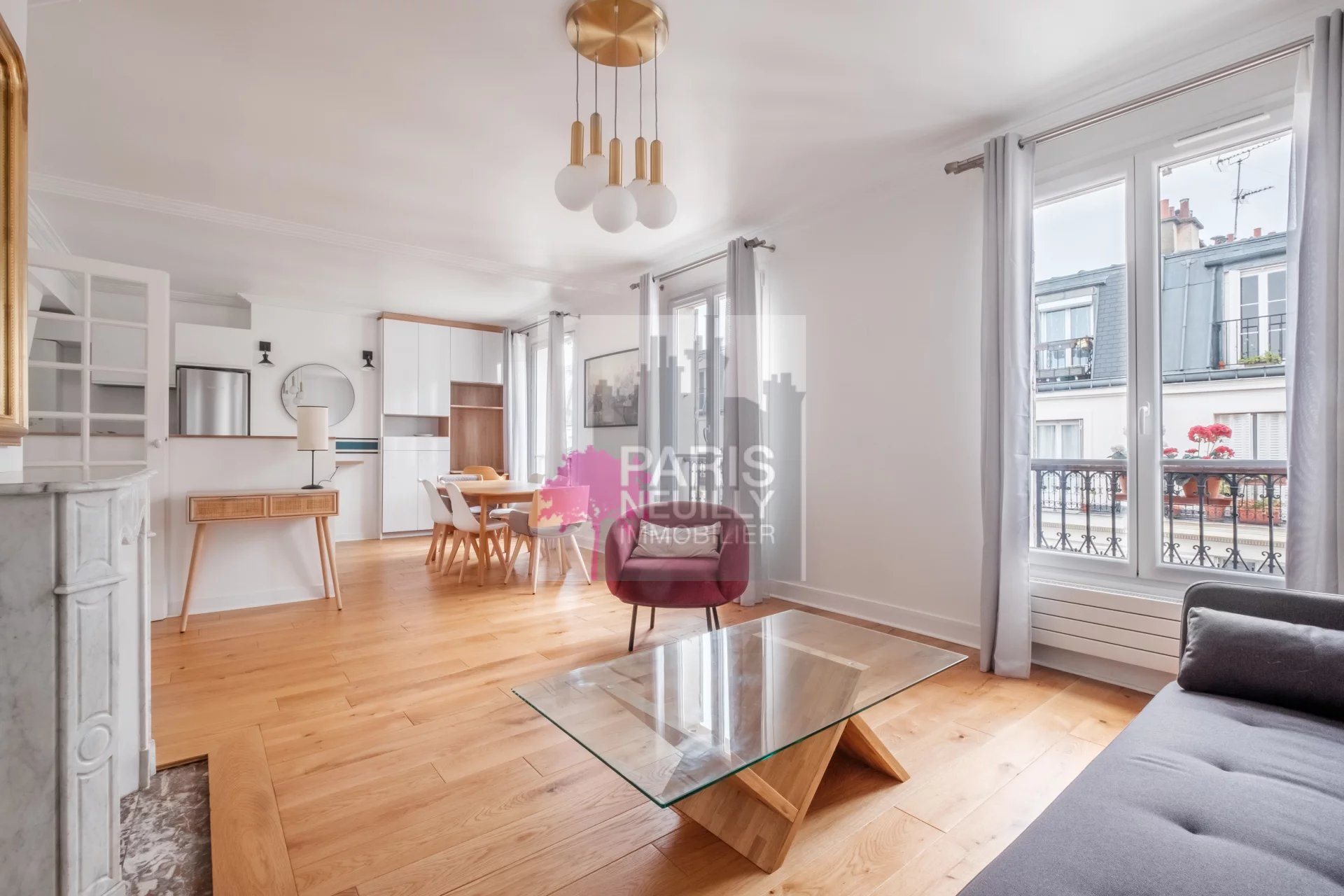 Paris 17ème - Rue Descombes Au 5étage Sans ascenseur , appartement Meuble de 60 m² Carrez et 76.50 m² au Sol comprenant : Entrée avec placard, séjour double lumineux avec belle cuisine ouverte, deux belles chambres (dont une sous les combles de 19 m²) et une salle de bains / WC. Très lumineux. Calme. Disponible de suite. Contact: Céline Olivier