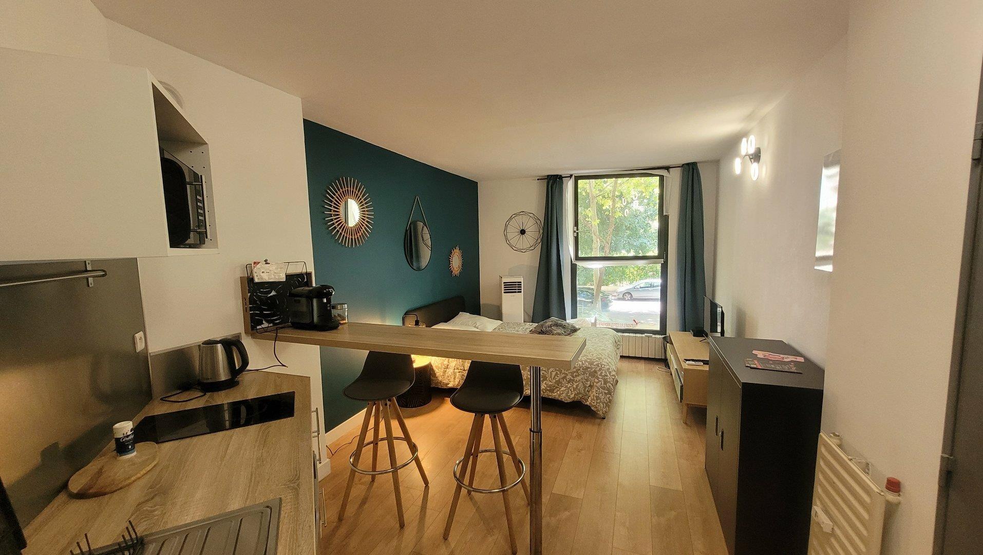 Studio Meuble - Montpellier ANTIGONE. Situé juste à côté du Polygone et à deux pas de la Place de la Comédie. Accès direct au Tramway ligne 1, parkings et stationnements publics disponibles devant le logement. Dans une belle résidence sécurisée. Coquet studio entièrement meublé et équipé, prêt à être utilisé ou mis en location. Honoraires inclus à charge vendeur.