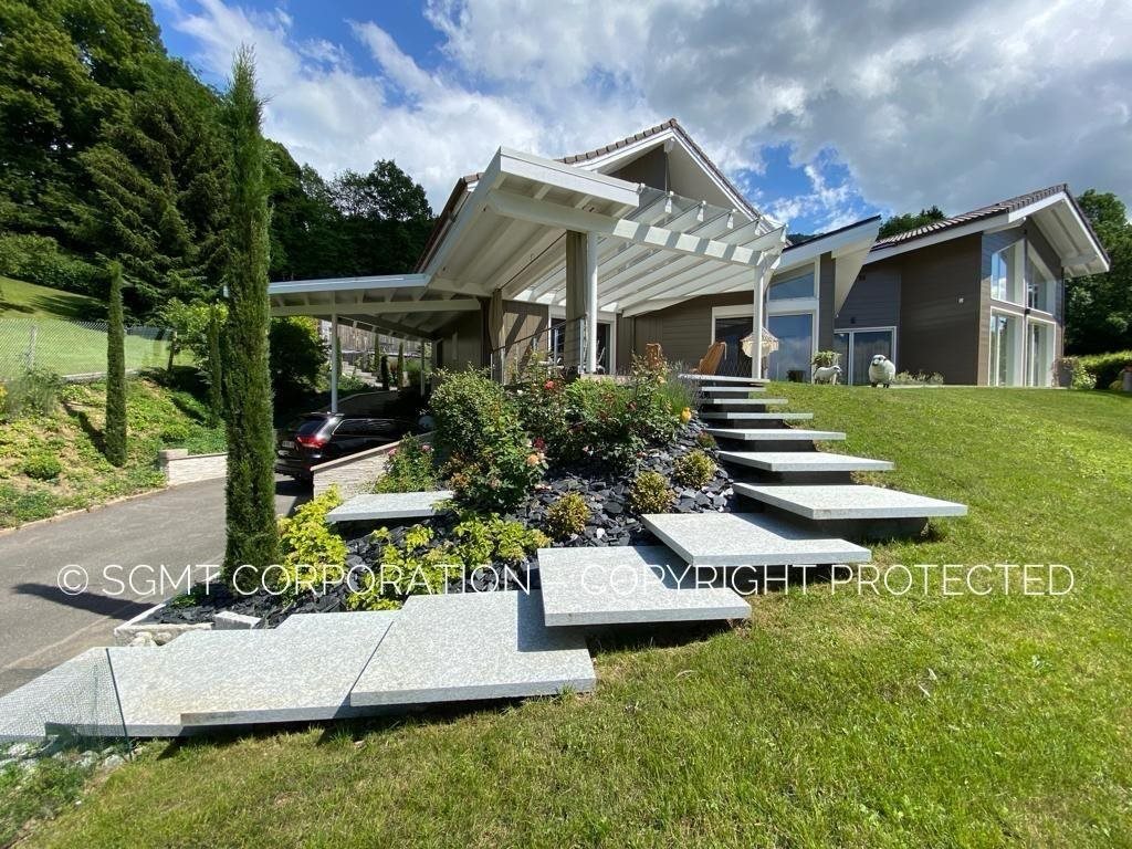 An exceptional three-bedroom contemporary villa, perched above Thonon-les-Bains, offering a rare harmony between cutting-edge design and absolute tranquillity. Set within a peaceful and privileged environment, the property enjoys breath-taking panoramic views of the surrounding mountains and Lake Geneva. Designed by an architect, this remarkable residence embodies the art of living between lake and mountains. Clean architectural lines, premium materials, and refined interior design create an atmosphere that is both elegant and serene - a sanctuary of light, space, and comfort. Offering 298 m² of living space (388 m² total usable area), the villa is arranged over three levels and combines luxury, technology, and seamless indoor-outdoor living. Key Highlights: - Prime location just 12 minutes from Thonon-les-Bains and its harbour - Easy access to Geneva and Lausanne - Close to the renowned Portes du Soleil ski resorts (Morzine, Les Gets, Avoriaz) - Heated indoor swimming pool (8m x 4.5m) - Advanced smart home technology system (lighting, alarm, video surveillance, remote pool management) - Contemporary open-plan architecture - Double garage + single garage + additional outdoor parking - Underfloor heating throughout -------------------------------------------------------------------------------------- Interior Layout :- Lower Ground Floor: - Double garage and single garage with internal staircase access - Laundry and utility room - Generous storage areas - Wine cellar, ideal for collectors and enthusiasts Raised Ground Floor: - Accessed via a sheltered tiled exterior staircase. - Elegant entrance hall with dressing room and guest Wc - Designer kitchen opening onto a spacious and welcoming open-plan living and entertainment area - Glass fireplace and striking glass staircase - Tv snug / relaxation corner - Central glazed living-dining space opening directly onto the terrace - Heated indoor swimming pool with en-suite shower room - Transparent safety curtain - Remote electric heating and cleaning system - Integrated air dehumidifier - Additional reception/entertainment area with wood-burning stove - Sculptural spiral staircase leading to the upper level First Floor: - 27 m² glazed reception area with fireplace overlooking the pool - Luxurious master suite featuring glazed wall and floor panels with pool views - Bright atrium converted into a bespoke dressing room - Two additional double bedrooms - Two uniquely designed bathrooms with premium finishes - Reading room (potential fourth bedroom) - Glass balustrade overlooking the staircase Exterior Living: The villa is surrounded by approximately 250 m² of terraces encircling the property. A thoughtful blend of wood and tiled flooring, combined with carefully integrated vegetation, creates multiple atmospheres for relaxation and entertaining. - Summer kitchen, ideal for long lunches and evening gatherings - Electric gate access for vehicles and pedestrians - Landscaped cypress-lined driveway with parking for several cars -------------------------------------------------------------------------------------- Location - Le Lyaud: Located in the charming village of Le Lyaud, in the Chablais region between Lake Geneva and the Alps, this residential community offers a peaceful and natural setting while remaining exceptionally well connected. Thonon-les-Bains and its harbour are reachable in approximately ten minutes, providing easy access to Lausanne and Geneva. The area is surrounded by forests and walking trails, with beautiful views toward Mont d'Hermone. Le Lyaud is a growing and highly sought-after address, offering essential daily amenities including schools, shops, medical services, sports facilities, and regular bus connections to Thonon. It is particularly attractive for those seeking a green and tranquil lifestyle within close proximity to the French-Swiss employment market. -------------------------------------------------------------------------------------- This outstanding property offers a rare blend of technology, refinement, and year-round indoor-outdoor living in one of the most desirable settings between lake and mountains. For further information or to arrange a private viewing, please contact us