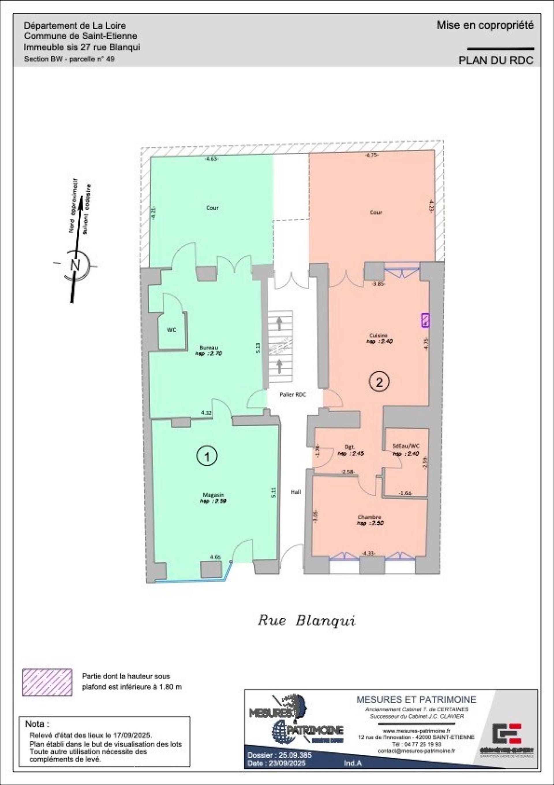 Appartement 2 pièces 47 m² Je vous propose ce plateau de 47 m2 à aménager en rdc, à proximité de la place de l'hôtel de ville, rue Blanqui , pour création d'une habitation ( changement de destination possible) ou commerce. Le plateau est livré avec compteurs individuels eau et électricité. Le bien bénéficie d'une terrasse privative de 20m2 dans la cour. Lot n°1 sur le plan. Le lot n°2 est un appartement rénové avec terrasse vendu 52000 euros Fai Je propose également un plateau propre ( isolation sol et fenêtres dv , porte pallière 3 points) de 52 m2 à 39000 euros Fai rue du soleil et deux appartements à rénover de 55 et 62 m2, rue de la république à St Chamond à 760 euros Fai le m2. Contact de préférence par téléphone. Le bien comprend 1 lot, et il est situé dans une copropriété de 10 lots (les charges courantes annuelles moyennes de copropriété sont de 320 € et le syndicat des copropriétaires ne fait pas l'objet d'une procédure citée à l'article L. 721-1 du code de la construction et de l'habitation). Les informations sur les risques auxquels ce bien est exposé sont disponibles sur le site Géorisques : Prix de vente : 25 000 € Honoraires charge vendeur Contactez votre conseiller Safti : Philippe Bastin, Tél. : [Coordonnées masquées], E-mail : [Coordonnées masquées] - Ei - Agent commercial immatriculé au Rsac de Saint-Etienne sous le numéro Surface : 47 m² Non soumis au Dpe Honoraires à la charge du vendeur A propos de la copropriété : Pas de procédure en cours Nombre de lots : 10 Charges prévisionnelles annuelles : 320 € Consommation énergie primaire : Ns kWh/m²/an Consommation énergie finale : Non communiqué