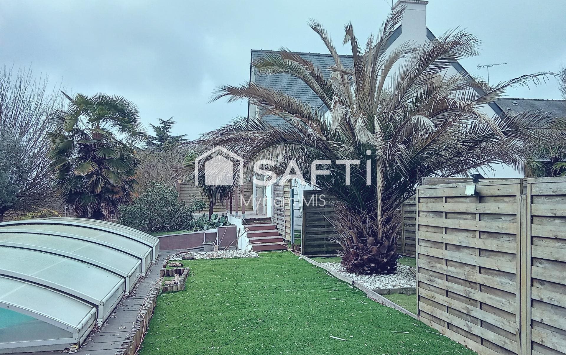 Je vous propose à la vente cette belle maison des années 80 de 180 m2 sur sous-sol semi enterré et terrain de 1130 m2. Au calme dans une impasse, vous serez charmer par ses beaux volumes, ses extérieurs aménagés et arborés, et par sa piscine couverte et chauffée par une Pac indépendante et avec traitement par électrolyse au sel. Elle se compose au rez-de-chaussée surélevé, d'une entrée lumineuse desservant une cuisine aménagée, d'un salon - séjour de 36 m2 avec cheminée et double exposition, de deux chambres de 11 m2 +/- dont une avec un grand dressing, d'un wc indépendant avec lave-main et d'une salle de douche. La terrasse en bois orientée Est et Sud est accessible depuis la cuisine. A l'étage, vous profiterez de deux belles chambres 25 m2 chacune avec fenêtres de toit en double exposition, pouvant être partagée et d'une salle de bain entièrement rénovée avec wc. Le sous-sol - murs et plafond entièrement habillés en styrodur et lambris - peut accueillir deux voitures. Il dispose également d'un local à bois, d'un atelier, d'une buanderie et, d'une salle de jeu et de détente avec bar. La maison est équipée de menuiseries en Pvc en double vitrage au Sud et triple vitrage au Nord avec volets électriques connectés et d'une Vmc double flux. Le nettoyage de la toiture et le ravalement ont été réalisés en 2020. Le terrain est en grande partie sur pelouse synthétique, et possède un jardin en carrés potager. L'ensemble est entièrement clos et l'accès se fait par deux portails motorisés avec interphone. Les informations sur les risques auxquels ce bien est exposé sont disponibles sur le site Géorisques : Prix de vente : 574 000 € Honoraires charge vendeur Contactez votre conseiller Safti : Myriam Mis, Tél. : , E-mail : - Ei - Agent commercial immatriculé au Rsac de Rennes sous le numéro 818 894 743