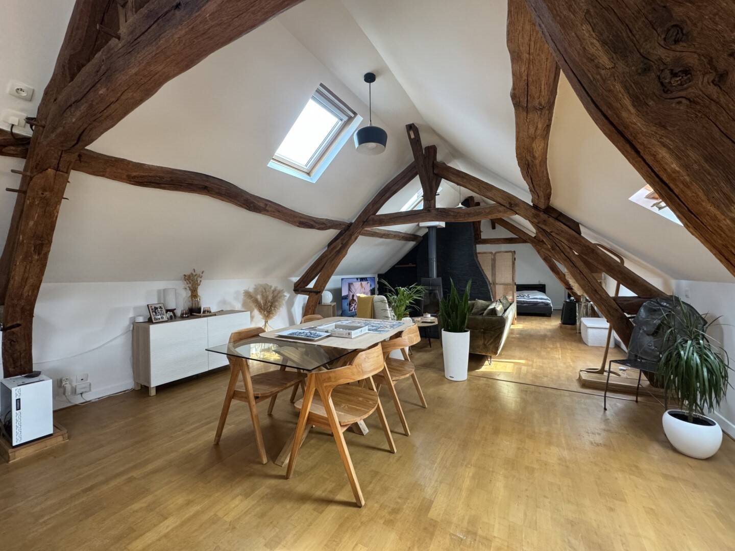 30Mn Villers Cotterets, centre ville, loft situé au dernier étage d'un immeuble ancien, du charme avec entrée, séjour 70m² avec poêle à bois et coin cuisine équipée, 2 chambres, salle de douches et wc. Libre fin février 2026. Honoraires agence € 650.