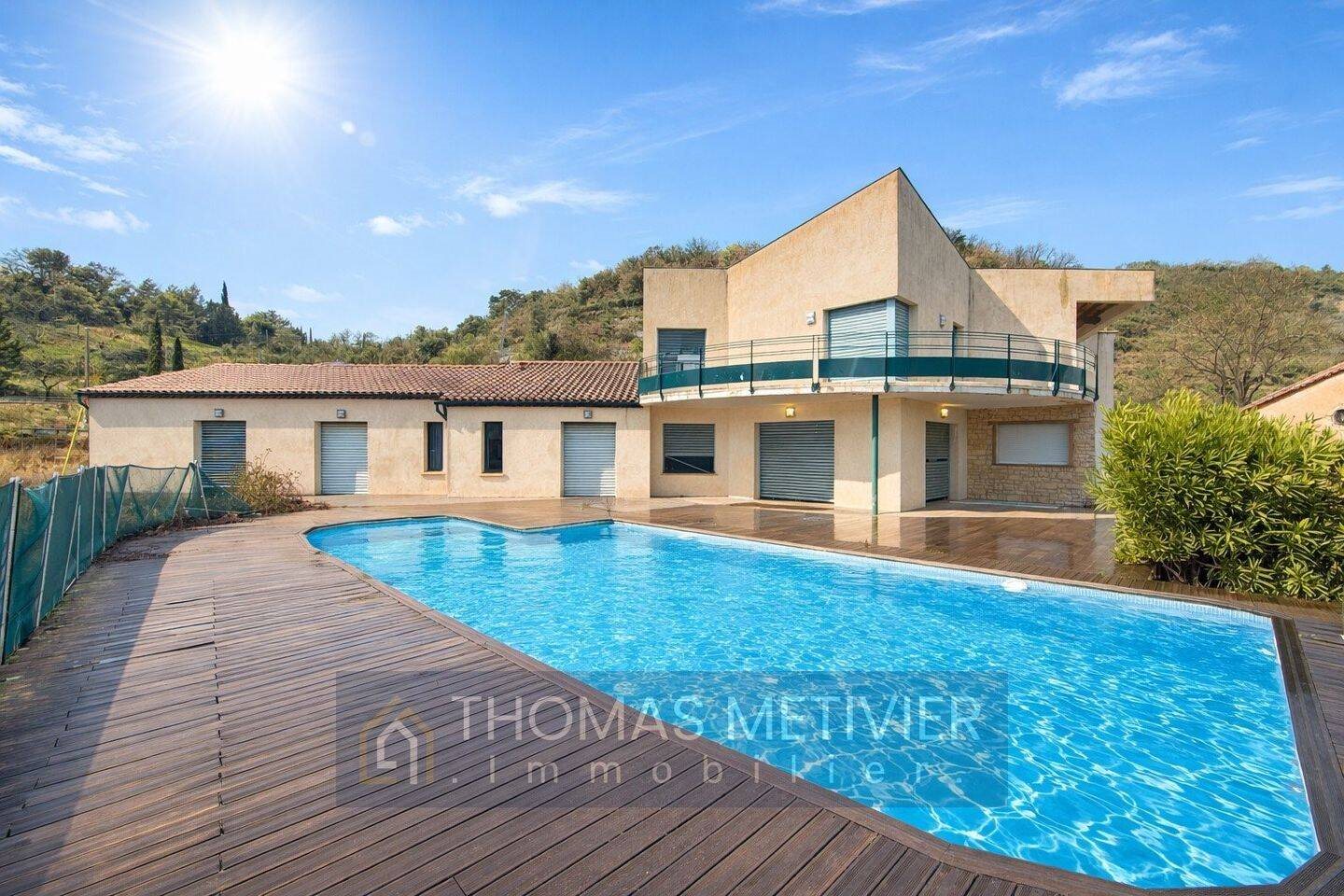 À Bédarieux, villa d'architecte de 2004 offrant 280 m² habitables. Superbe séjour avec cuisine ouverte et cheminée de 80 m², 5 chambres avec salle d'eau ou salle de bains privative, bureau et mezzanine. Cellier, buanderie, nombreux rangements. Implantée sur un terrain divisible de 7 000 m² avec piscine, cette propriété séduit par ses volumes, sa luminosité et son originalité. Bien rare sur le secteur. Honoraires à la charge du vendeur