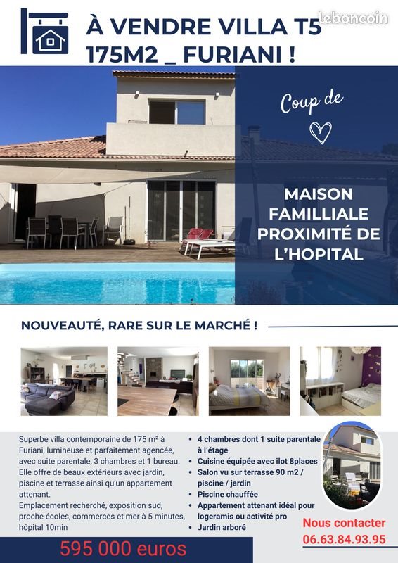 Découvrez cette superbe villa de 175 m², édifiée en 2009, située dans un environnement recherché à Furiani. Lumineuse et parfaitement agencée, elle offre de très belles prestations. Composition : Rez-de-chaussée : Entrée desservant un spacieux séjour avec cheminée Cuisine ouverte entièrement équipée, avec îlot central pouvant accueillir 8 personnes 3 belles chambres avec placards intégrés 1 bureau salle de jeu 1 salle de bain Wc séparé À l’étage : Suite parental comprenant dressing, salle d’eau et Wc, balcon Extérieurs : Jardin arboré Piscine chauffée et agréable terrasse de 90m2 2 places de parking Cabanon de rangement Appartement attenant, idéal pour recevoir des amis ou pour une activité professionnelle Atouts supplémentaires : Orientation sud, garantissant une belle luminosité Proximité immédiate des écoles, collège, lycée, commerces, centres d’activités de Furiani/Bastia Accès facile en bus La mer à seulement 5 minutes Une belle opportunité à saisir ! N’hésitez pas à me pour toute information complémentaire ou pour organiser une visite.