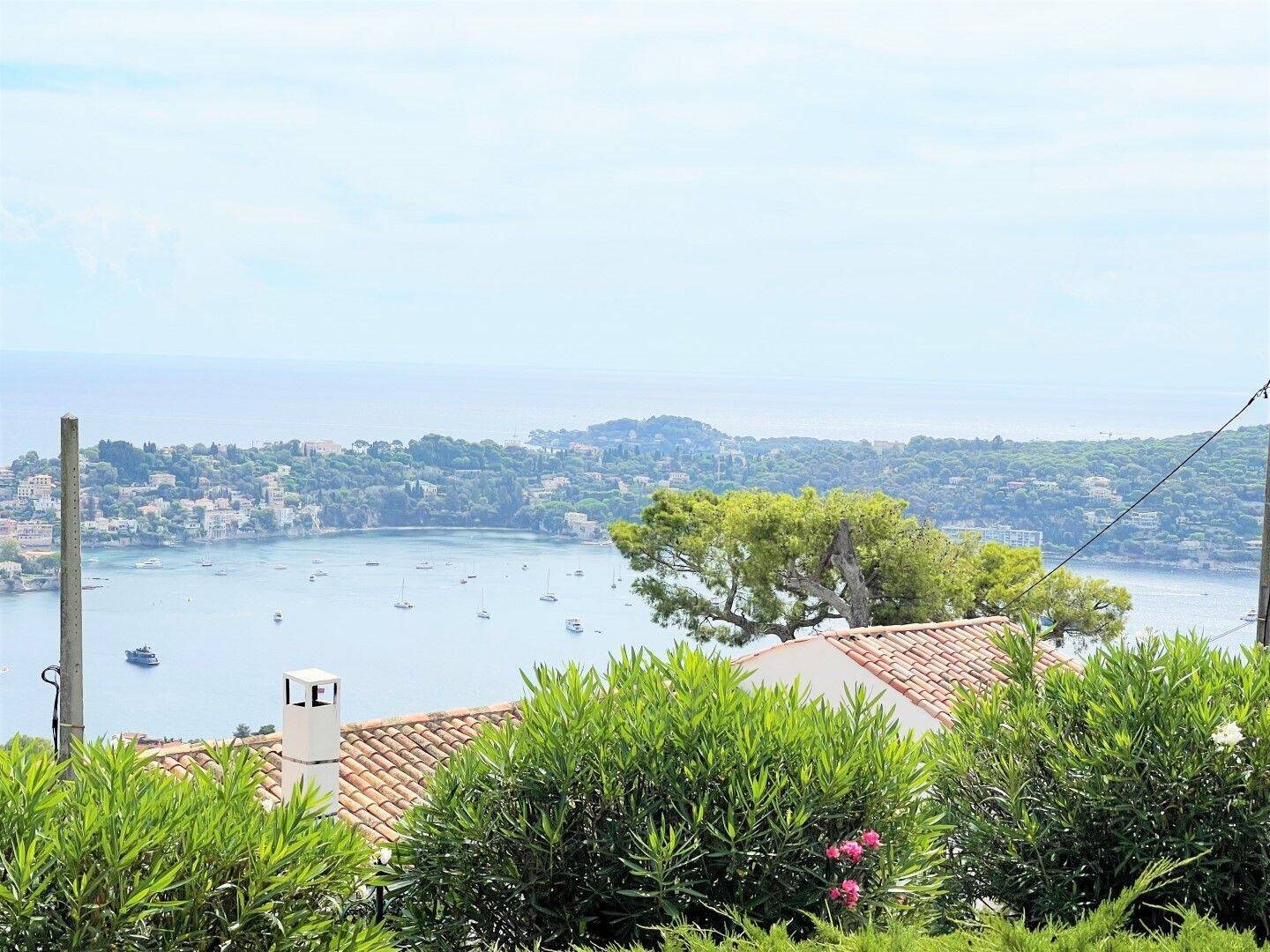 Vue Mer Panoramqiue sur rad de Villefranche st jean cap Ferrat. Dans une jolie résidence sécurisée, Appartement 2 pcs de 60m2 + grande Terrasses et Jardin Privatif de 275m2 clos et arboré sans vis-à-vis. Appartement refait entièrement à neuf par Architecte, composé d'un beau séjour de plus de 30m2 avec 2,80m de hauteur sous plafond, grandes fenêtres avec vue plongeante Mer sans vis-à-vis, cuisine Américaine entièrement équipée (plan marbre, équipements électroménagers etc..), 1 chambre calme, salle d'eau aménagé, dépendance pour buanderie. Vendu Meublé équipé. Très belles prestations : Clim encastrée programmable en Domotique, volets électriques etc… Vendu avec 1 cave et 1 emplacement de parking au s/sol avec accès ascenseur privatif. Accès Pmr Proche toutes commodités : commerces etc.. Très rare !