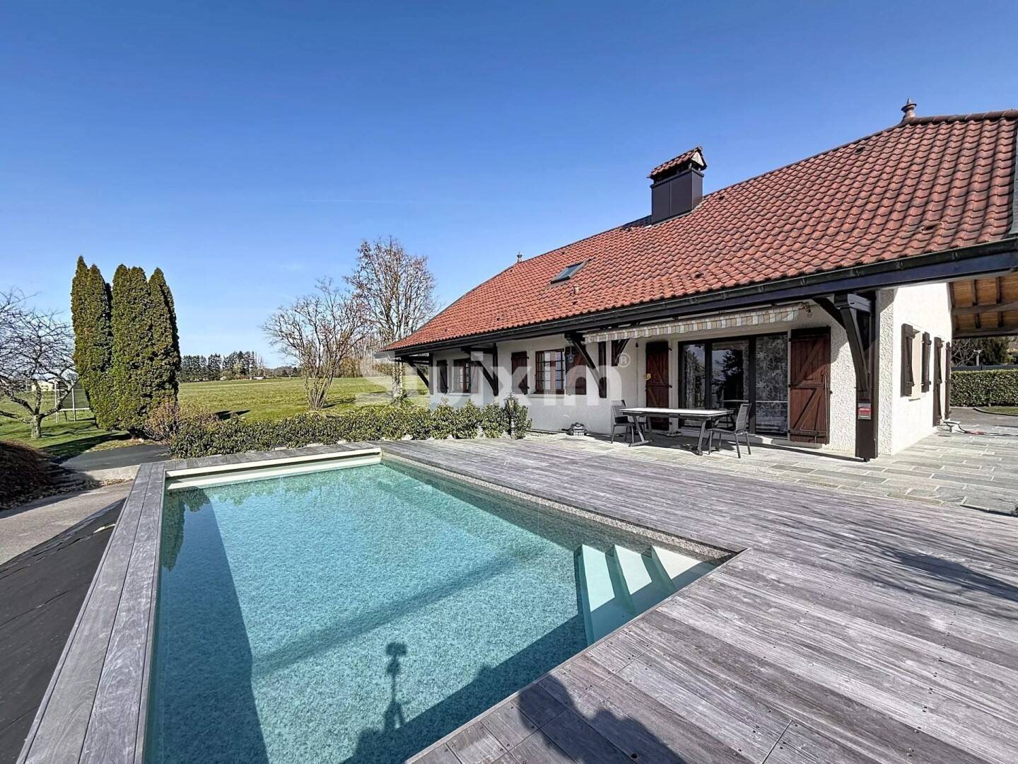 Acr305/ Ballaison: Laissez-vous séduire par cette charmante maison des années 80, parfaitement entretenue, offrant 180 m² habitables sur une magnifique parcelle arborée de 2 100 m², avec vue dégagée sur le lac et sous-sol complet. Dès l’entrée, vous découvrirez une belle pièce de vie lumineuse composée d’une cuisine ouverte, d’un espace salle à manger et d’un salon convivial, le tout bénéficiant d’un accès direct à une agréable terrasse, idéale pour profiter des beaux jours et du panorama. Le rez-de-chaussée comprend également deux chambres confortables, une salle de bain ainsi que des toilettes indépendantes. À l’étage, un grand espace de dégagement dessert deux spacieuses chambres, un dressing et une salle d’eau, offrant un espace nuit parfaitement adapté à une vie de famille. Le bien dispose également d’un double garage avec sous-sol complet, incluant une buanderie aménagée avec de nombreux rangements, apportant fonctionnalité et confort au quotidien. À l’extérieur, vous profiterez d’un superbe jardin arboré, d’une grande piscine et d’une magnifique terrasse en bois, créant un véritable espace de détente dans un environnement calme et privilégié. Un bien rare, idéal pour une famille en quête d’espace, de confort et d’un cadre de vie exceptionnel. À découvrir sans tarder.