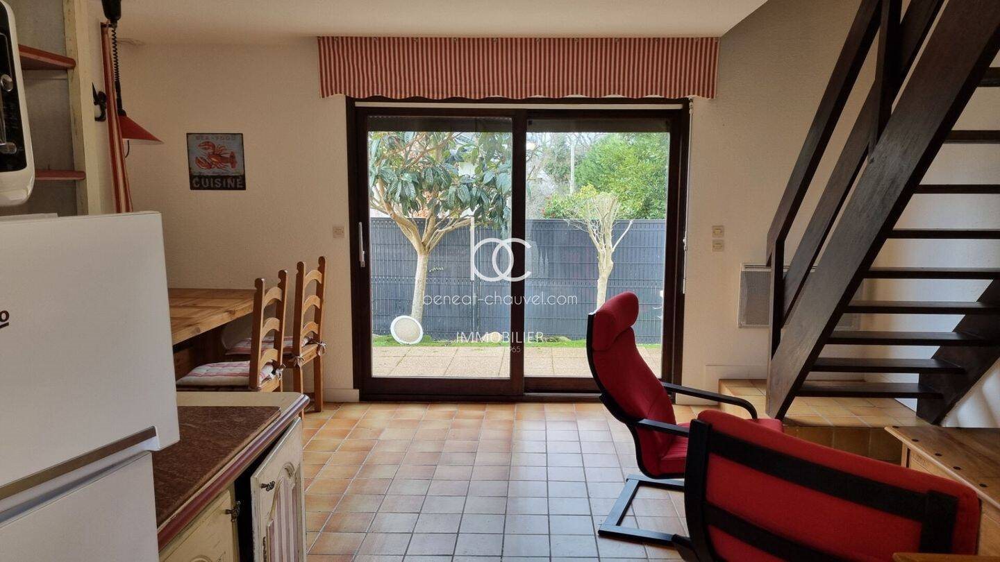 A proximité immédiate de la plage, dans une résidence, Maison d'habitation Meublee mitoyenne d'un côté et comprenant : Rez-De-Chaussee : Entrée - Séjour - Cuisine américaine équipée et aménagée - Salle d'eau et W.C.- Etage : Deux chambres (chauffage électrique) Cellier extérieur Jardinet privatif Libre De Suite