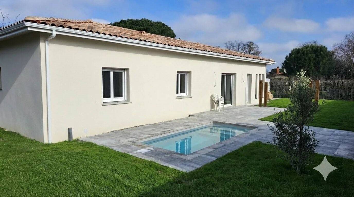 Villa neuve de plain pied au calme Piscine sans vis à vis, Belle terrasse Espace de vie climatisé et lumineux Cuisine haut de gamme ouverte 4 chambres avec placard 2 salles de douche wc Bureau-buanderie garage