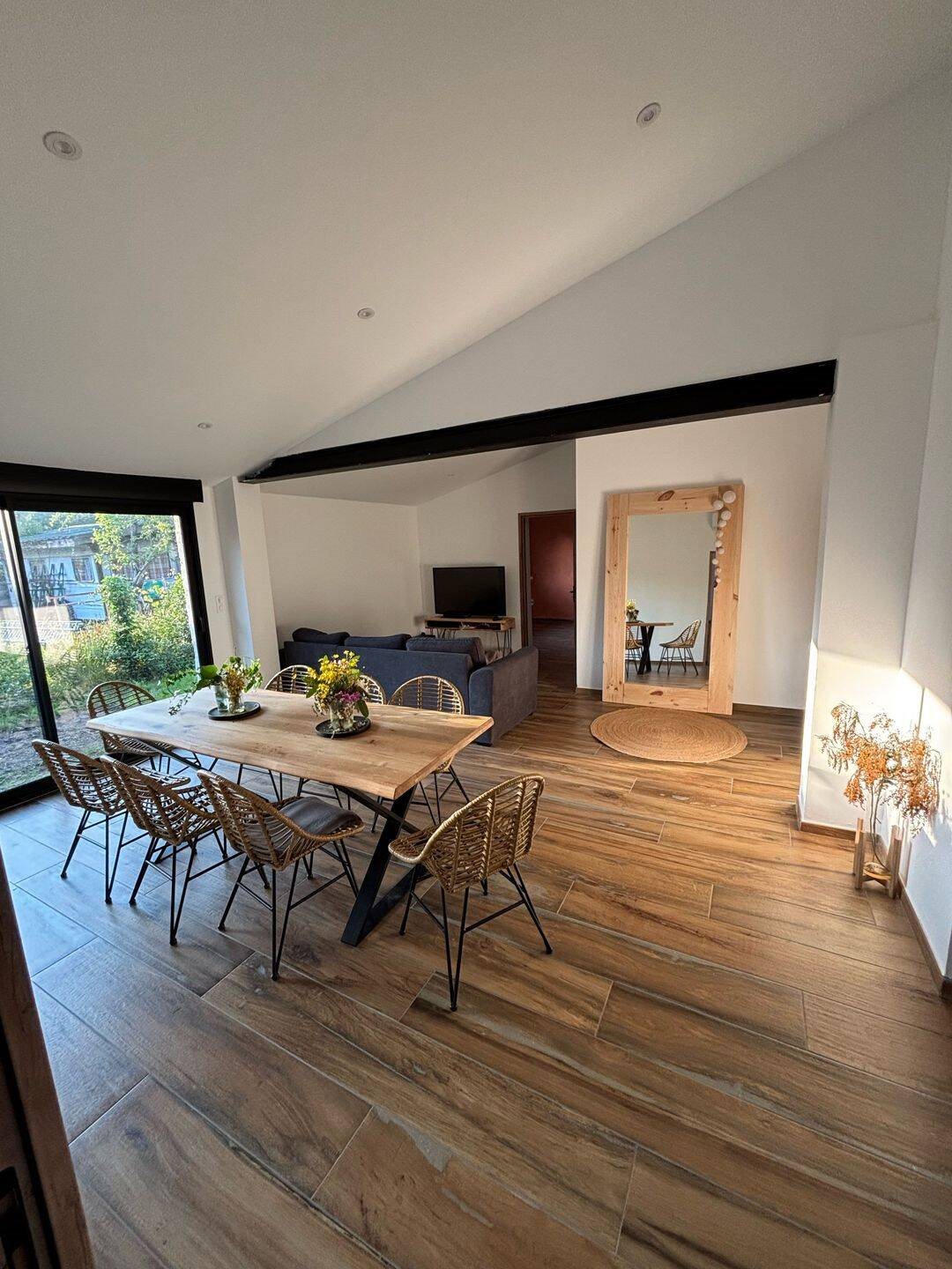 Maison Bonjour, Maison location meublé, 75m2 habitable de plein pied. Route de Peybideau à Salles, quartier calme, en seconde ligne avec un jardin clos de 430m2. Maison T4 neuve (-2ans) 3 chambre, une Sdb avec grande baignoire, douche italienne, double vasque, sè...