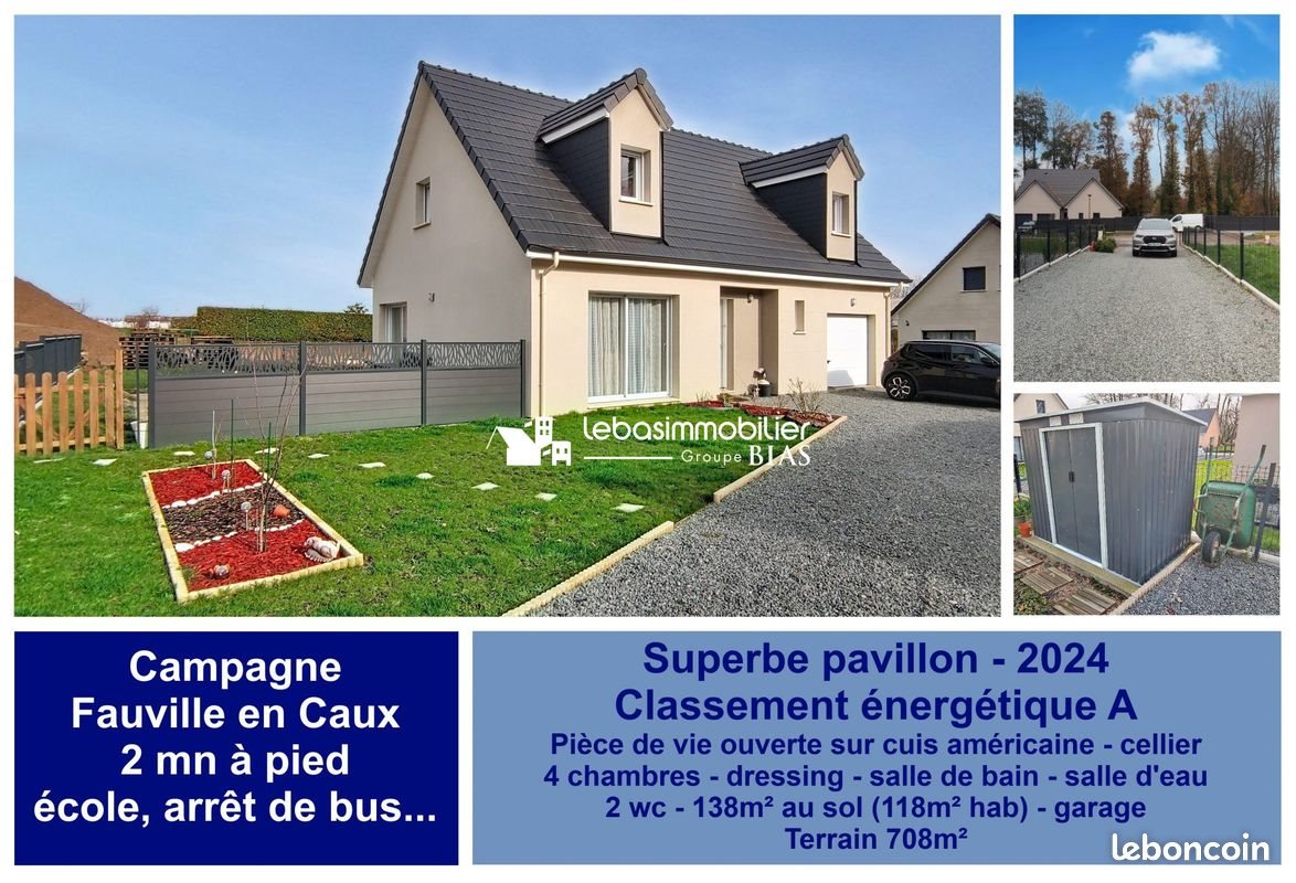 Exclusivite Maison Individuelle - 2024 - 139 m² (119m² hab.) - 4 Chambres Découvrez cette superbe maison individuelle de 2024, située à 5mn de Fauville en Caux. Cette maison allie élégance et fonctionnalité. Au RdC : spacieux séjour lumineux, cuisine américaine, chambre, salle d'eau (douche), wc, cellier et garage. À l'étage : 3 chambres dont 1 avec dressing, salle de bain (baignoire et douche), wc. L'extérieur ne manque pas de d'atouts avec une terrasse de 20 m², idéale pour profiter des beaux jours. Le terrain de 708 m² offre un espace vert agréable. Pompe à chaleur, ouvertures en PVC/aluminium à double vitrage garantissent une isolation optimale : classement énergétique A. Ne manquez pas cette opportunité de vivre dans une résidence de qualité, alliant modernité et confort. Commodités à proximité : Plusieurs commodités sont accessibles en quelques minutes, dont des écoles, des commerces et des transports en commun. Honoraires à la charge du vendeur. Classe énergie A, Classe climat A Montant estimé des dépenses annuelles d'énergie pour un usage standard : entre 480.00 euros et 700.00 euros sur les années 2021, 2022 et 2023 (abonnements compris). Les informations sur les risques auxquels ce bien est exposé sont disponibles sur le site Géorisques : .