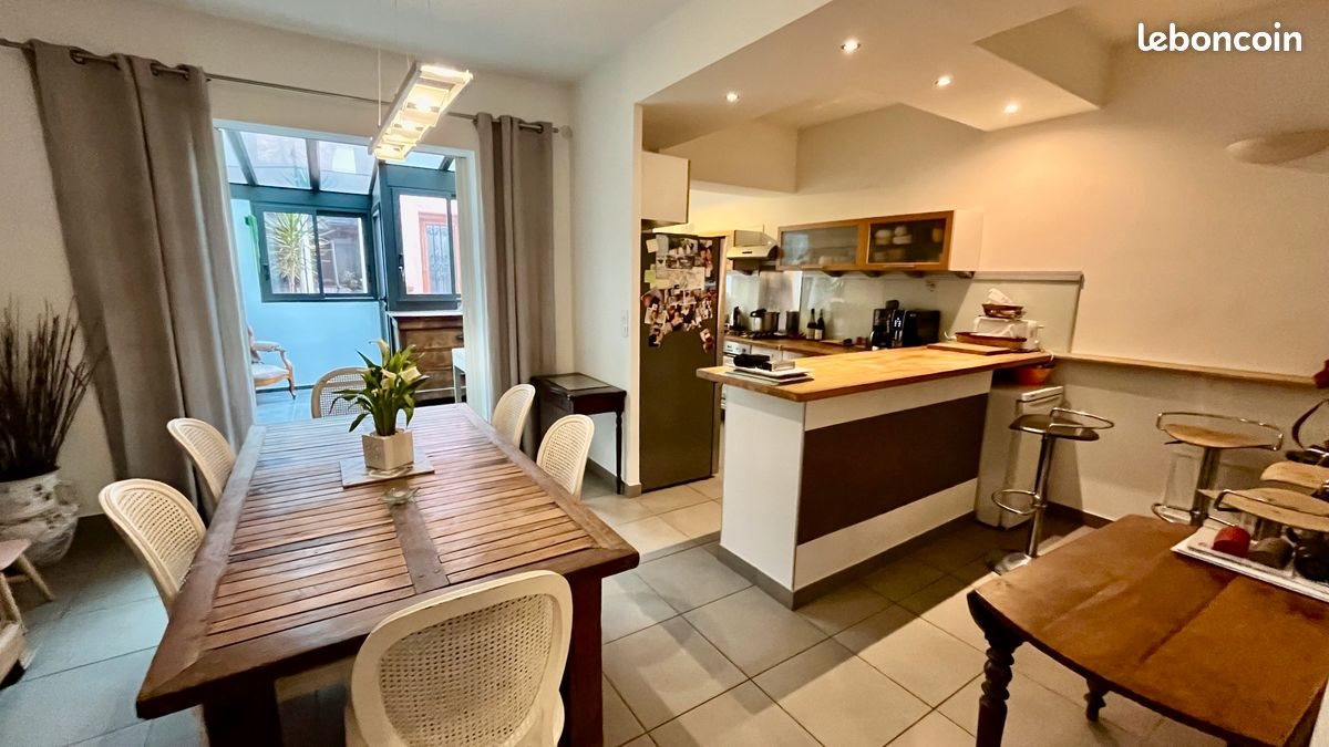 13005 Quartier Baille - Berceau à proximité du métro, au calme, superbe maison de ville rénovée, avec terrasse et garage moto/atelier. Belle maison atypique sur 2 niveaux , de 135m2 habitables disposée comme suit - voir plan en photo : au rez-de-chaussée d'un séjour - cuisine Us de 50M2 donnant sur véranda de 10M2, garage moto/atelier de 22M2 , bureau et wc. A l'étage : 4 superbes chambres, une salle d'eau, une salle de bains et wc indépendant. Une terrasse avec pergola allu de 32M2 et abris de jardin complète ce bien. La maison est équipée de doubles vitrages, volets roulants électriques, climatisation réversible. Toiture et isolation récente. Taxe foncière : 1 364€/an