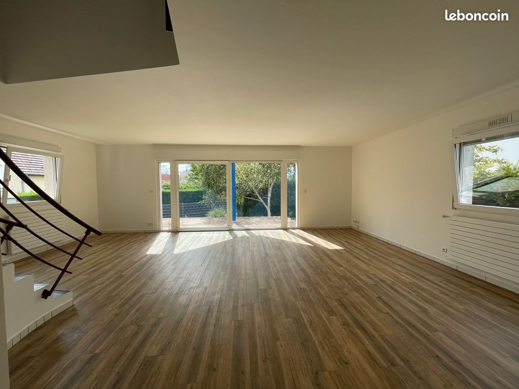 Dans une petite résidence privée, appartement lumineux de 120m² au sol et spacieux jardin et grand garage individuel de 60m² situé dans une résidence privée et calme, proche de la nature. L’Appartement dans un style résolument contemporain s’ouvre sur un séjour de 55m² baigné de lumière grâce à sa large ouverture donnant accès au jardin arboré et paisible. L’Importante pièce à vie s’ouvre sur une cuisine séparé meublée et équipée d’une plaque de cuisson, hotte et évier, un dégagement menant sur un toilette individuel. L’Escalier vous mène à l’étage dispatchant sur la salle de bains avec fenêtre et agrémenté d’une baignoire et d’un meuble double vasque, 1 toilette séparée, et 3 chambres, dont 2 avec balcon. Disponible fin janvier Garage et jardin privé Aucun frais d’agence, Location de particulier à particulier. Loyer mensuel est de 1200€ + 300 € (avance sur charges comprenant le chauffage collectif), Résidence 20 Rue de l’Ill 67640 Lipsheim Proximité Gare Fegersheim-Lipsheim, Proche de toutes commodités, écoles, commerces de proximités,