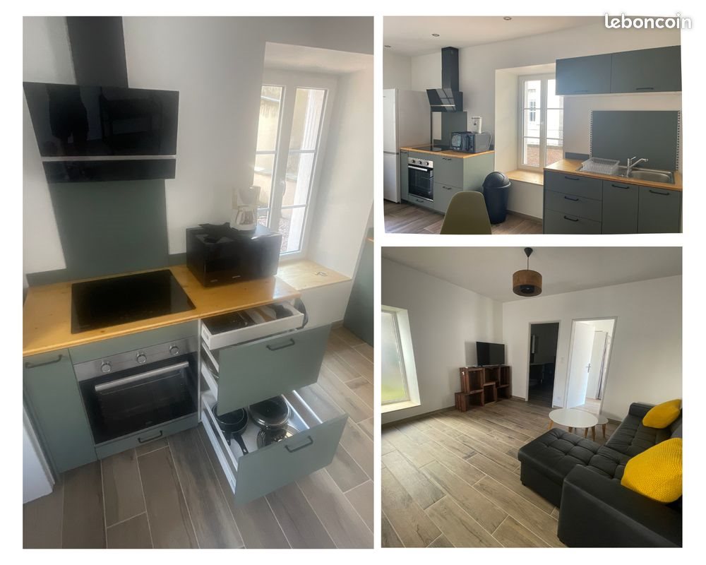 Issoire – à deux pas du centre-ville, dans une ruelle calme. Appartement indépendant situé en rez-de-chaussée d’un petit immeuble de 3 logements, avec accès Pmr et place de parking juste à proximité. Logement 45 M2 meublé neuf (mise en service août 2024) – matériaux de qualité, lumineux, confortable et économe en énergie : Pompe à chaleur réversible (chauffage + climatisation), Volets roulants électriques, Double vitrage, excellente isolation, Normes énergétiques récentes, Faible consommation. Fibre optique Descriptif : Cuisine / séjour entièrement équipé : Cuisine aménagée complète, Plaques induction, hotte, four, micro-ondes, Réfrigérateur congélateur, Cafetière, Vaisselle et ustensiles de cuisine, Table + 4 chaises, Coin salon avec canapé d’angle convertible, Table basse, meuble Tv, télévision Chambre : Lit double (140x160) avec couette et oreillers, Dressing, Bureau Salle d’eau : Grande douche carrelée, Meuble vasque, Wc, Machine à laver Loyer : 630 € / mois Charges : 20 € / mois (taxe d’ordures ménagères) Disponible au 1er avril Visite uniquement après étude du dossier Premier contact par messagerie avec : Situation professionnelle, Type de contrat, revenus, Nombre d’occupants, Date souhaitée d’entrée dans les lieux